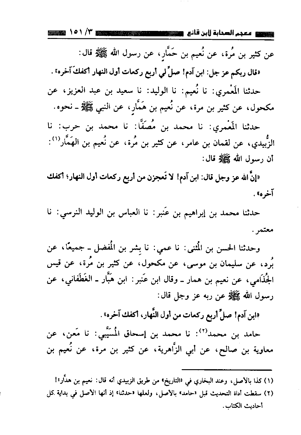 حَدَّثَنَا مُحَمَّدُ بْنُ إِبْرَاهِيمَ بْنِ عَنْبَرٍ، نا الْعَبَّاسُ بْنُ الْوَلِيدِ النَّرْسِيُّ، نا مُعْتَمِرٌ، وَحَدَّثَنَا الْحَسَنُ بْنُ الْمُثَنَّى، نا عَمِّي، نا بِشْرُ بْنُ الْمُفَضَّلِ، جَمِيعًا عَنْ بُرْدٍ، عَنْ سُلَيْمَانَ بْنِ مُوسَى، عَنْ مَكْحُولٍ، عَنْ كَثِيرِ بْنِ مُرَّةَ، عَنْ قَيْسٍ الْجُذَامِيِّ، عَنْ نُعَيْمِ بْنِ هَمَّارٍ وَقَالَ ابْنُ عَنْبَرٍ: ابْنُ هَبَّارٍ الْغَطَفَانِيُّ، عَنْ رَسُولِ اللَّهِ صَلَّى اللهُ عَلَيْهِ وَسَلَّمَ عَنْ رَبِّهِ عَزَّ وَجَلَّ قَالَ: «ابْنَ آدَمَ صَلِّ أَرْبَعَ رَكَعَاتٍ مِنْ أَوَّلِ النَّهَارِ أَكْفِكَ آخِرَهُ» حَدَّثَنَا حَامِدُ بْنُ مُحَمَّدٍ، نا مُحَمَّدُ بْنُ إِسْحَاقَ الْمُسَيَّبِيُّ , نا مَعْنٌ، عَنْ مُعَاوِيَةَ بْنِ صَالِحٍ، عَنْ أَبِي الزَّاهِرِيَّةِ، عَنْ كَثِيرِ بْنِ مُرَّةَ، عَنْ نُعَيْمِ بْنِ ⦗١٥٢⦘ هَبَّارٍ عَنِ النَّبِيِّ صَلَّى اللهُ عَلَيْهِ وَسَلَّمَ نَحْوَهُ
