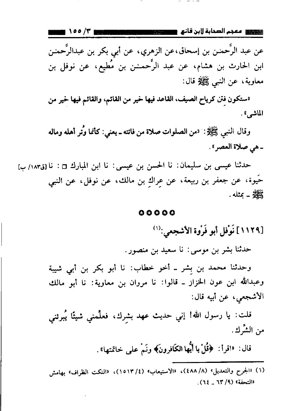 حَدَّثَنَا بِشْرُ بْنُ مُوسَى، نا سَعِيدُ بْنُ مَنْصُورٍ، وَحَدَّثَنَا مُحَمَّدُ بْنُ بِشْرٍ أَخُو خَطَّابٍ، نا أَبُو بَكْرِ بْنُ أَبِي شَيْبَةَ، وَعَبْدُ اللَّهِ بْنِ عَوْنٍ الْخَرَّازُ قَالُوا: نا مَرْوَانُ بْنُ مُعَاوِيَةَ، نا أَبُو مَالِكٍ الْأَشْجَعِيُّ، عَنْ أَبِيهِ قَالَ: قُلْتُ: يَا رَسُولَ اللَّهِ إِنِّي حَدِيثُ عَهْدٍ بِشِرْكٍ فَعَلِّمْنِي شَيْئًا يُبَرِّئُنِي مِنَ الشِّرْكِ قَالَ: «اقْرَأْ قُلْ يَا أَيُّهَا الْكَافِرُونَ وَنَمْ عَلَى خَاتِمَتِهَا» ⦗١٥٦⦘ فَمَا أَخْطَأَهَا أَبِي حَتَّى مَاتَ