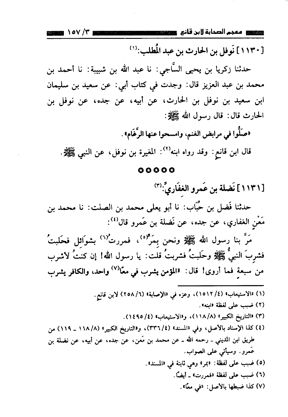 حَدَّثَنَا فَضْلُ بْنُ حُبَابٍ، نا أَبُو يَعْلَى مُحَمَّدُ بْنُ الصَّلْتِ , نا مُحَمَّدُ بْنُ مَعْنٍ الْغِفَارِيُّ، عَنْ جَدِّهِ، عَنْ نَضْلَةَ بْنِ عَمْرٍو قَالَ: مَرَّ بِنَا رَسُولُ اللَّهِ صَلَّى اللهُ عَلَيْهِ وَسَلَّمَ وَنَحْنُ بِمَرٍّ فَمَرَرْتُ بِشَوَائِلَ فَحَلَبْتُ فَشَرِبَ النَّبِيُّ صَلَّى اللهُ عَلَيْهِ وَسَلَّمَ وَحَلَبْتُ فَشَرِبْتُ قُلْتُ يَا رَسُولَ اللَّهِ , إِنْ كُنْتُ لَأَشْرَبُ مِنْ سَبْعَةٍ فَمَا أُرْوَى قَالَ: «الْمُؤْمِنُ يَشْرَبُ فِي مِعًا وَاحِدٍ وَالْكَافِرُ يَشْرَبُ ⦗١٥٨⦘ فِي سَبْعَةِ أَمْعَاءٍ» قَالَ عَبْدُ الْبَاقِي: وَلَمْ يَضْبِطْ إِسْنَادَهُ