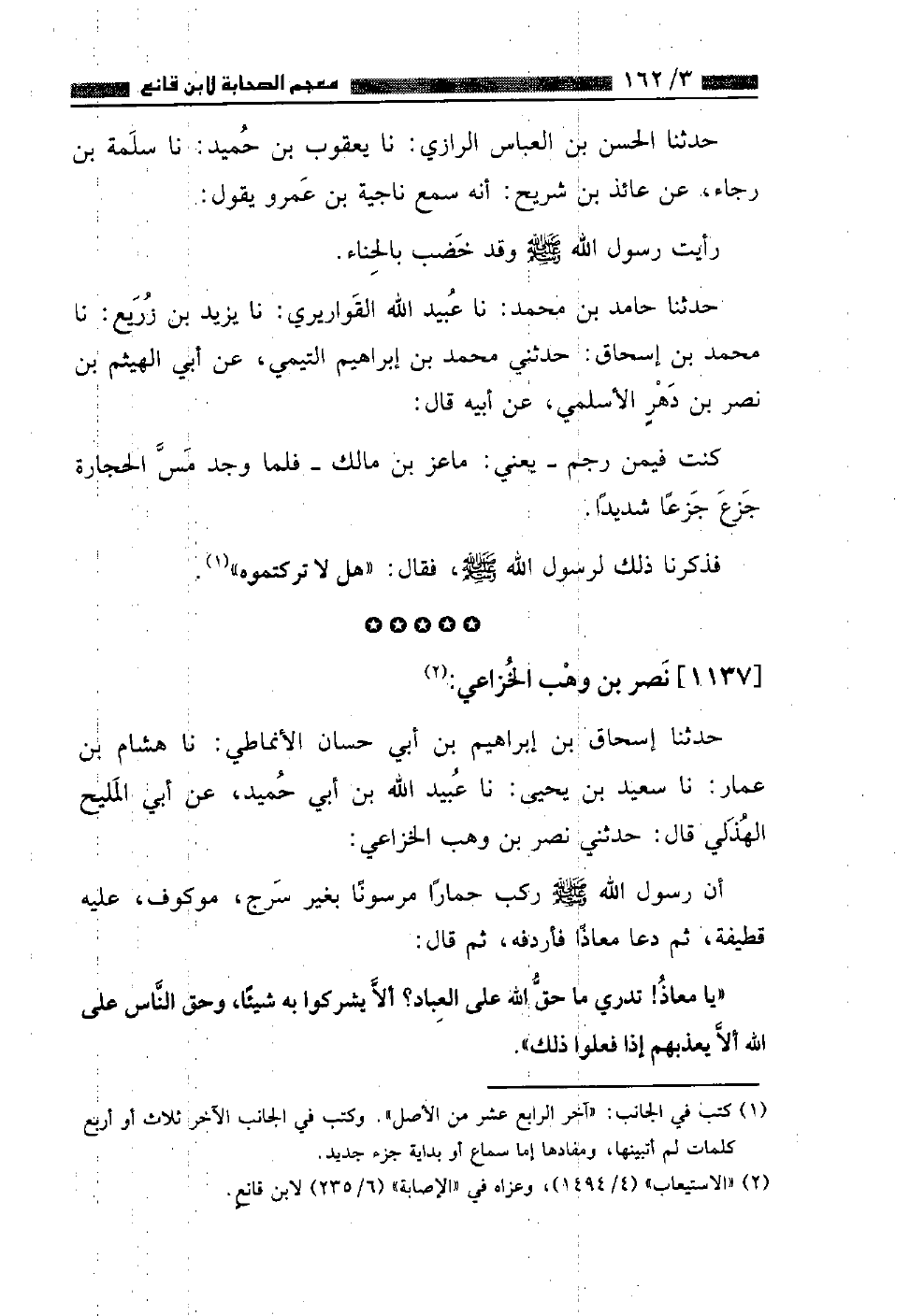 حَدَّثَنَا إِسْحَاقُ بْنُ إِبْرَاهِيمَ بْنِ أَبِي حَسَّانَ الْأَنْمَاطِيُّ، نا هِشَامُ بْنُ عَمَّارٍ، نا سَعِيدُ بْنُ يَحْيَى، نا عُبَيْدُ اللَّهِ بْنُ أَبِي حُمَيْدٍ، عَنْ أَبِي الْمَلِيحِ الْهُذَلِيِّ قَالَ: حَدَّثَنِي نَصْرُ بْنُ وَهْبٍ الْخُزَاعِيُّ، «أَنَّ رَسُولَ اللَّهِ صَلَّى اللهُ عَلَيْهِ وَسَلَّمَ رَكِبَ حِمَارًا مَرْسُونًا بِغَيْرِ سَرْجٍ مَوْكُوفًا , عَلَيْهِ قَطِيفَةٌ ثُمَّ دَعَا مُعَاذًا فَأَرْدَفَهُ» ثُمَّ قَالَ: «يَا مُعَاذُ تَدْرِي مَا حَقُّ اللَّهِ عَلَى الْعِبَادِ أَلَا يُشْرِكُوا بِهِ شَيْئًا , وَحَقُّ النَّاسِ عَلَى اللَّهِ أَلَا يُعَذِّبَهُمْ إِذَا فَعَلُوا ذَلِكَ»