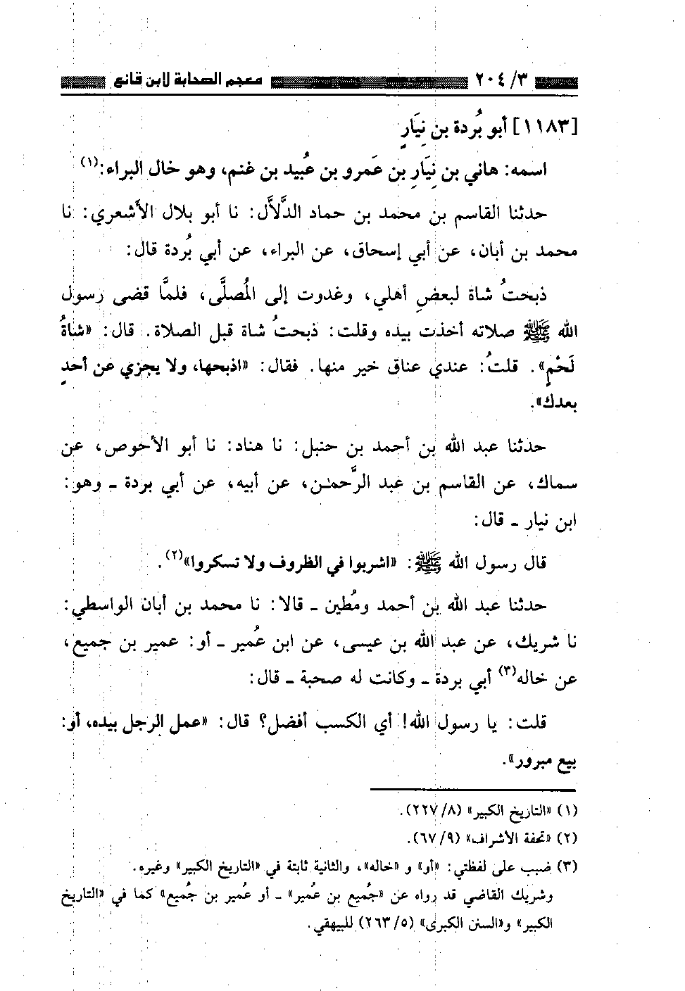 ١١٨٣ - أَبُو بُرْدَةَ بْنُ نِيَارٍ اسْمُهُ هَانِي بْنُ نِيَارِ بْنِ عَمْرِو بْنِ عُبَيْدِ بْنِ غَنْمٍ وَهُوَ خَالُ الْبَرَاءِ