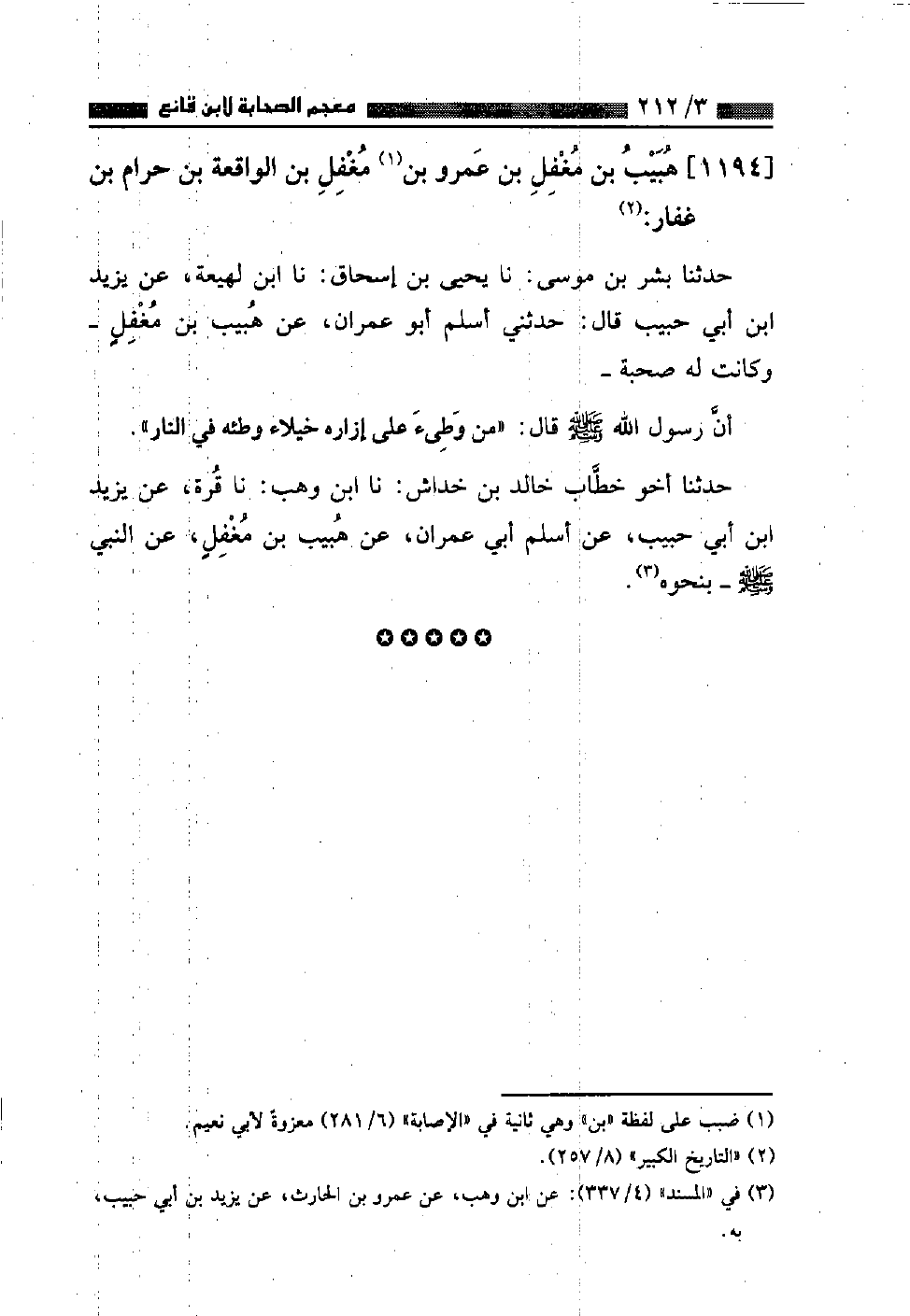 حَدَّثَنَا بِشْرُ بْنُ مُوسَى، نا يَحْيَى بْنُ إِسْحَاقَ، نا ابْنُ لَهِيعَةَ، عَنْ يَزِيدَ بْنِ أَبِي حَبِيبٍ قَالَ: حَدَّثَنِي أَسْلَمُ أَبُو عِمْرَانَ، عَنْ هُبَيْبِ بْنِ مُغَفَّلٍ، وَكَانَتْ لَهُ صُحْبَةٌ أَنَّ رَسُولَ اللَّهِ صَلَّى اللهُ عَلَيْهِ وَسَلَّمَ قَالَ: «مَنْ وَطِيءَ عَلَى إِزَارِهِ خُيَلَاءً وَطِئَهُ فِي النَّارِ» حَدَّثَنَا أَخُوَ خَطَّابٍ خَالِدُ بْنُ خِدَاشٍ، نا ابْنُ وَهْبٍ، نا قُرَّةُ، عَنْ يَزِيدَ بْنِ أَبِي حَبِيبٍ، عَنْ أَسْلَمَ أَبِي عِمْرَانَ، عَنْ هُبَيْبِ بْنِ مُغَفَّلٍ عَنِ النَّبِيِّ صَلَّى اللهُ عَلَيْهِ وَسَلَّمَ بِنَحْوِهِ