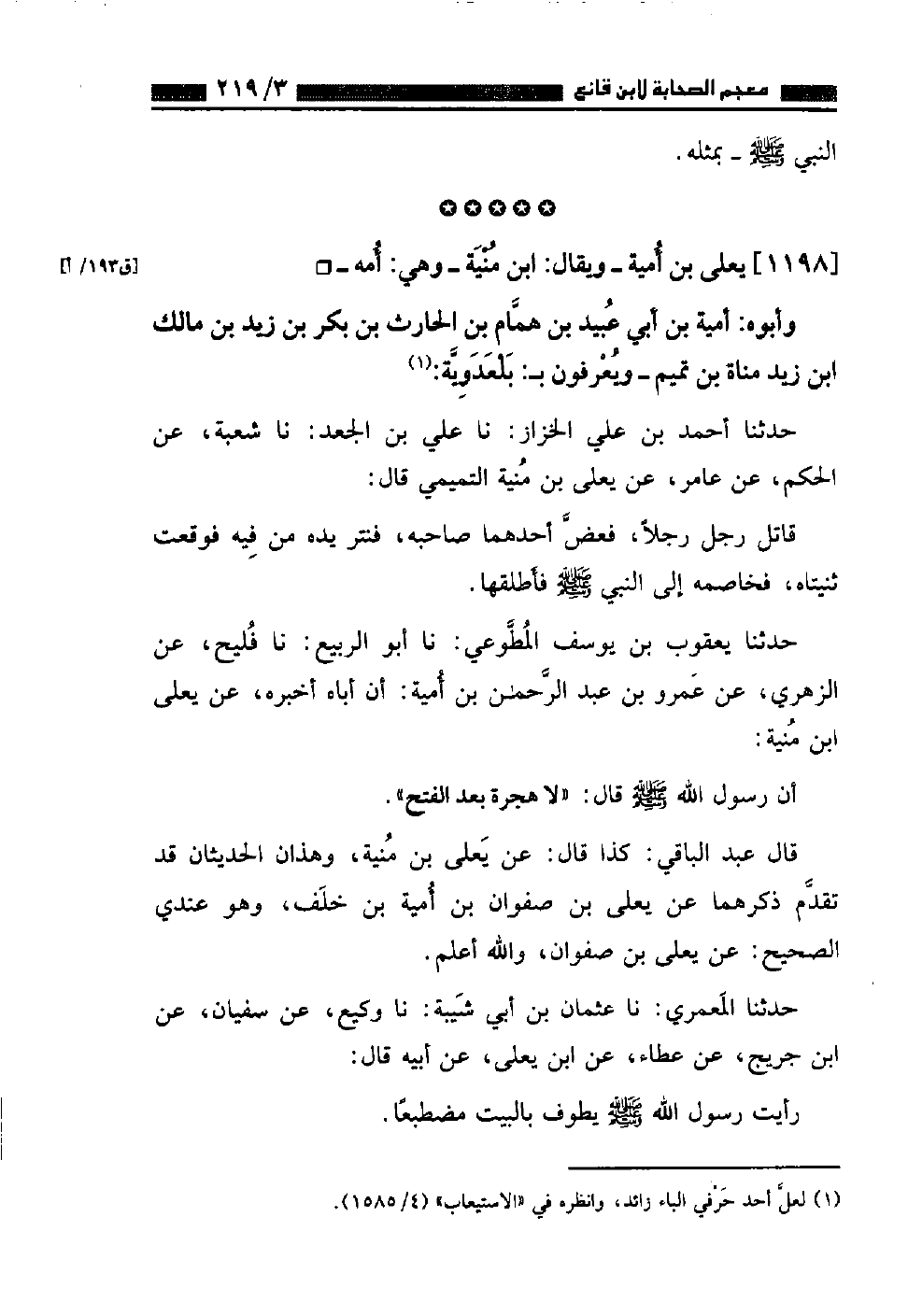 ١١٩٨ - يَعْلَى بْنُ أُمَيَّةَ وَيُقَالُ: ابْنُ مُنْيَةَ وَهِيَ أُمُّهُ وَأَبُوهُ أُمَيَّةُ بْنُ أَبِي عُبَيْدِ بْنِ هَمَّامِ بْنِ الْحَارِثِ بْنِ بَكْرِ بْنِ زَيْدِ بْنِ مَالِكِ بْنِ زَيْدِ مَنَاةَ بْنِ تَمِيمٍ وَيُعْرَفُونَ: بِلْعَدَوِيَّةِ