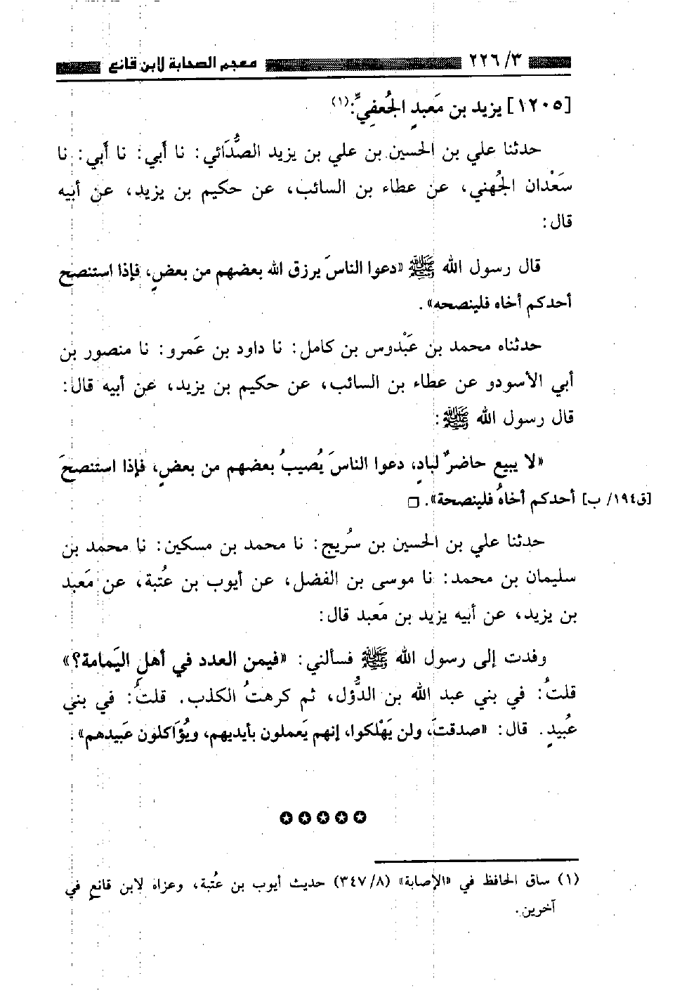 حَدَّثَنَا عَلِيُّ بْنُ الْحُسَيْنِ بْنِ عَلِيِّ بْنِ يَزِيدَ الصُّدَائِيُّ، نا أَبِي، نا أَبِي، نا سَعْدَانُ الْجُهَنِيُّ، عَنْ عَطَاءِ بْنِ السَّائِبِ، عَنْ حَكِيمِ بْنِ أَبِي يَزِيدَ، عَنْ أَبِيهِ قَالَ: قَالَ رَسُولُ اللَّهِ صَلَّى اللهُ عَلَيْهِ وَسَلَّمَ: «دَعُوا النَّاسَ يَرْزُقُ اللَّهُ بَعْضَهُمْ مِنْ بَعْضٍ فَإِذَا اسْتَنْصَحَ أَحَدُكُمْ أَخَاهُ فَلْيَنْصَحْهُ»