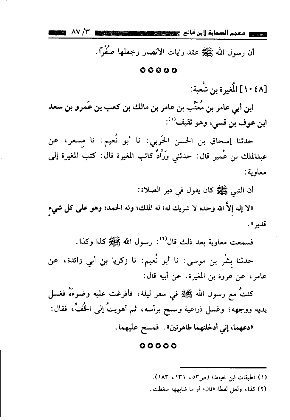 ١٠٤٨ - الْمُغِيرَةُ بْنُ شُعْبَةَ بْنِ أَبِي عَامِرِ بْنِ مُعَتِّبِ بْنِ عَامِرِ بْنِ مَالِكَ بْنِ كَعْبِ بْنِ عَمْرِو بْنِ سَعْدِ بْنِ عَوْفِ بْنِ قَسِّيٍّ وَهُوَ ثَقِيفٌ