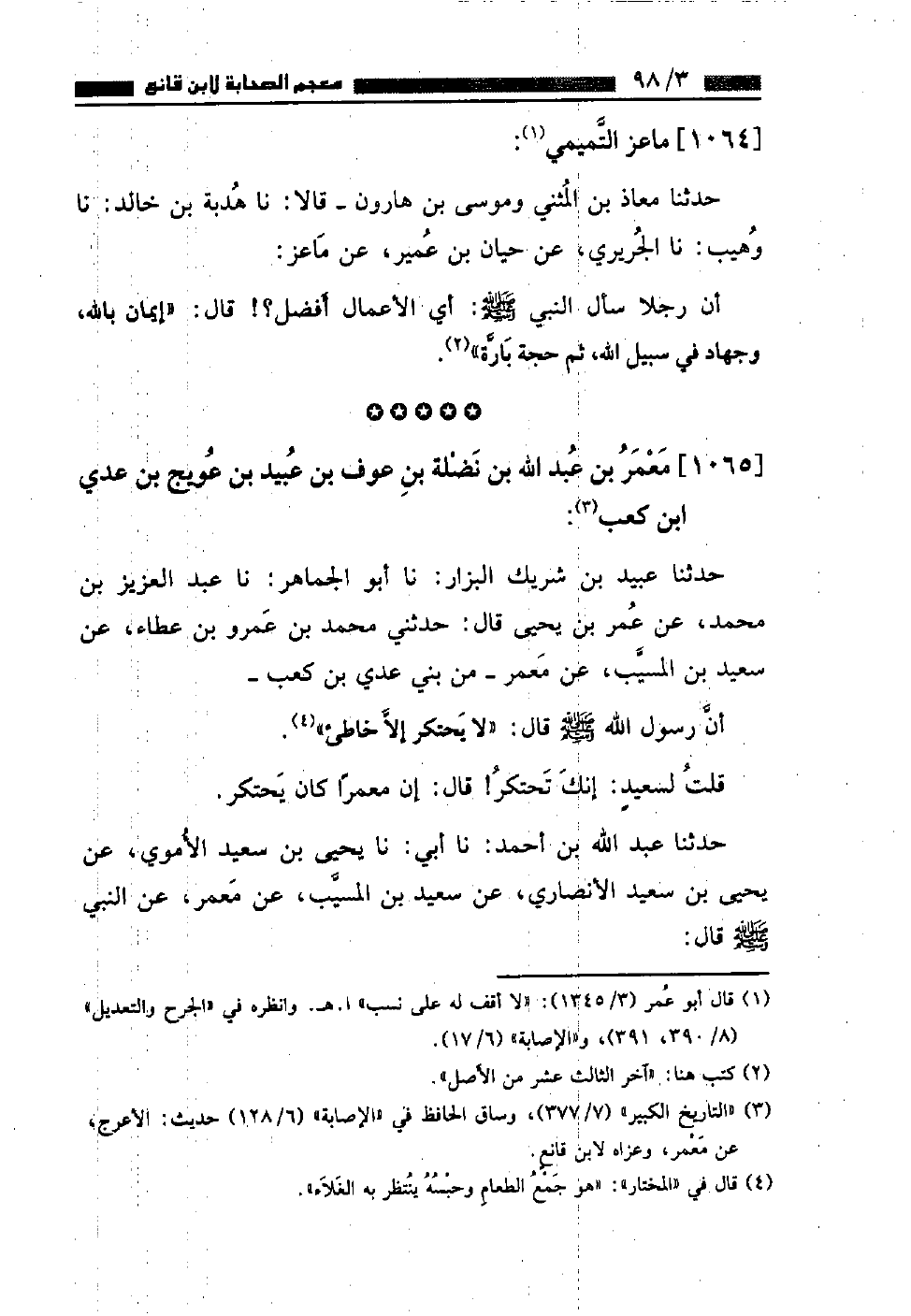 حَدَّثَنَا مُعَاذُ بْنُ الْمُثَنَّى، وَمُوسَى بْنُ هَارُونَ قَالَا: نا هُدْبَةُ بْنُ خَالِدٍ، نا وَهَيْبٌ، نا الْجُرَيْرِيُّ، عَنْ حَيَّانَ بْنِ عُمَيْرٍ، عَنْ مَاعِزٍ، أَنَّ رَجُلًا، سَأَلَ النَّبِيَّ صَلَّى اللهُ عَلَيْهِ وَسَلَّمَ أَيُّ الْأَعْمَالِ أَفْضَلُ؟ قَالَ: «إِيمَانٌ بِاللَّهِ وَجِهَادٌ فِي سَبِيلِ اللَّهِ ثُمَّ حَجَّةٌ بَارَّةٌ»