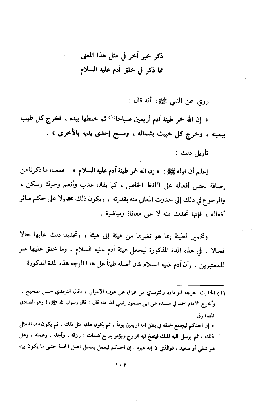إعلم أَن قَوْله صلى الله عَلَيْهِ وَسلم إِن الله خمر طِينَة آدم عَلَيْهِ السَّلَام فَمَعْنَاه مَا ذكرنَا من إِضَافَة بعض أَفعاله على اللَّفْظ الْخَاص كَمَا يُقَال عذب وأنعم وحرك وَسكن وَالرُّجُوع فِي ذَلِك إِلَى حُدُوث الْمعَانِي مِنْهُ بقدرته وَيكون ذَلِك مَحْمُولا على حكم سَائِر أَفعاله فَإِنَّهَا تحدث مِنْهُ لَا على معاناه ومباشرة