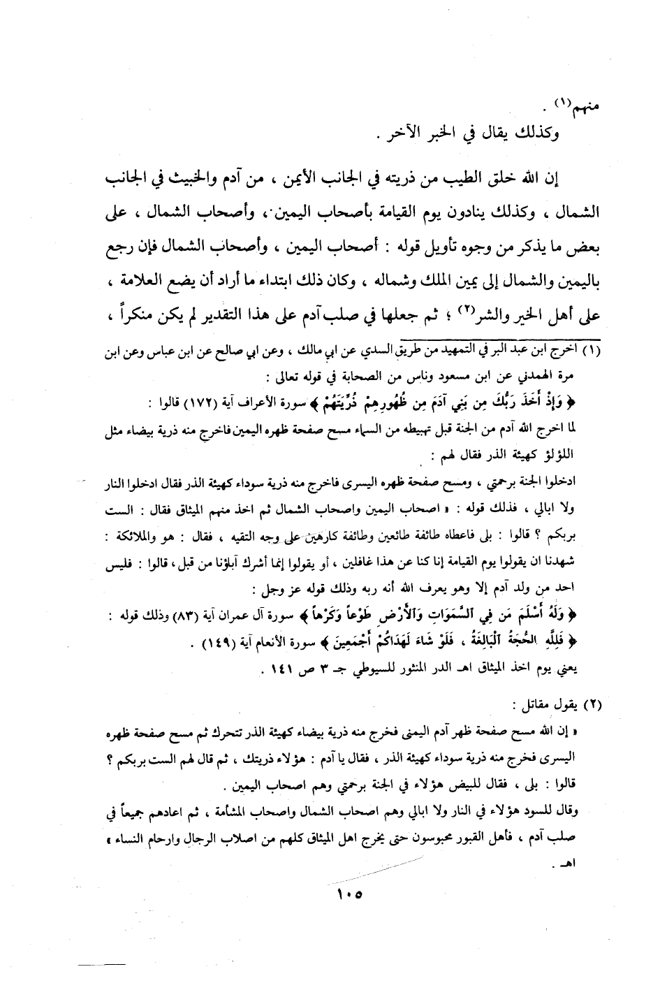 إِن الله خلق الطّيب من ذُريَّته فِي الْجَانِب الْأَيْمن من آدم والخبيث فِي الْجَانِب الشمَال وَكَذَلِكَ ينادون يَوْم الْقِيَامَة بأصحاب الْيَمين وَأَصْحَاب الشمَال على بعض مَا يذكر من وُجُوه تَأْوِيل قَوْله أَصْحَاب الْيَمين وَأَصْحَاب الشمَال فَإِن رَجَعَ بِالْيَمِينِ وَالشمَال إِلَى يَمِين الْملك وشماله وَكَانَ ذَلِك ابْتِدَاء مَا أَرَادَ أَن يضع الْعَلامَة على أهل الْخَيْر وَالشَّر ثمَّ جعلهَا فِي صلب آدم على هَذَا التَّقْدِير لم يكن مُنْكرا