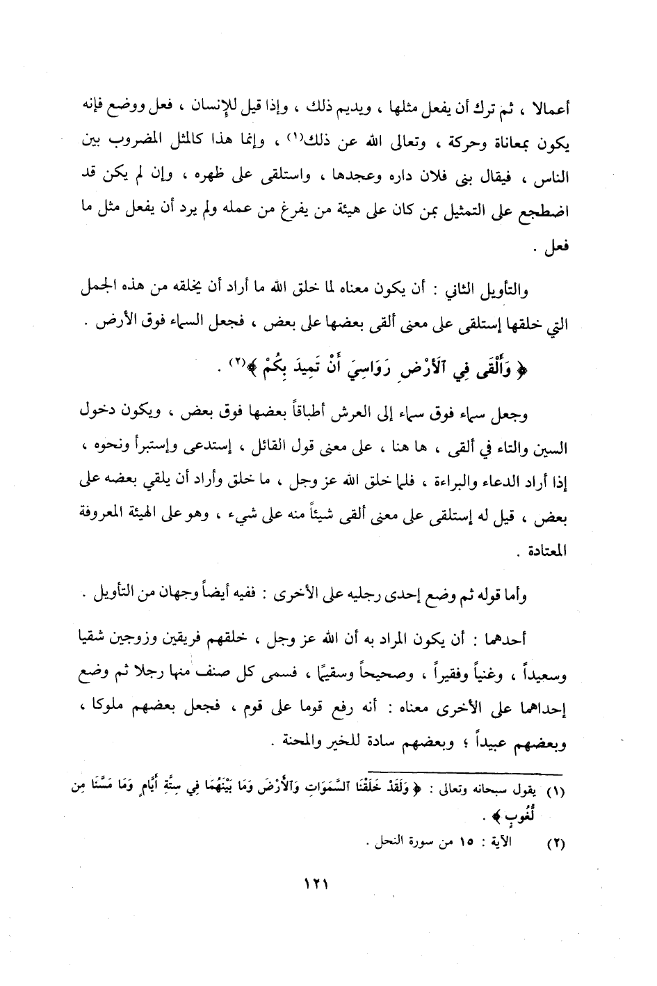 أعمالا ثمَّ ترك أَن يفعل مثلهَا ويديم ذَلِك وَإِذا قيل للْإنْسَان فعل وَوضع فَإِنَّهُ يكون بمعاناة وحركة وَتَعَالَى الله عَن ذَلِك وَإِنَّمَا هَذَا كالمثل الْمَضْرُوب بَين النَّاس فَيُقَال بني فلَان دَاره وعجدها واستلقى على ظَهره وَإِن لم يكن قد اضْطجع على التَّمْثِيل بِمن كَانَ على هَيْئَة من يفرغ من عمله وَلم يرد أَن يفعل مثل مَا فعل