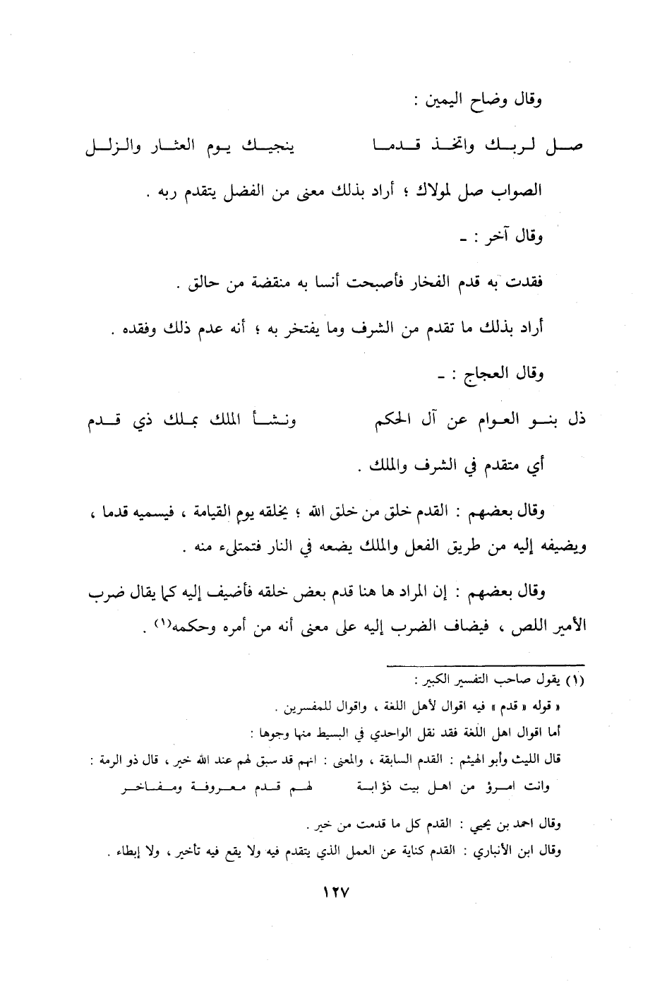 وَقَالَ بَعضهم الْقدَم خلق من خلق الله يخلقه يَوْم الْقِيَامَة فيسميه قدما ويضيفه إِلَيْهِ من طَرِيق الْفِعْل وَالْملك يَضَعهُ فِي النَّار فتمتلئ مِنْهُ