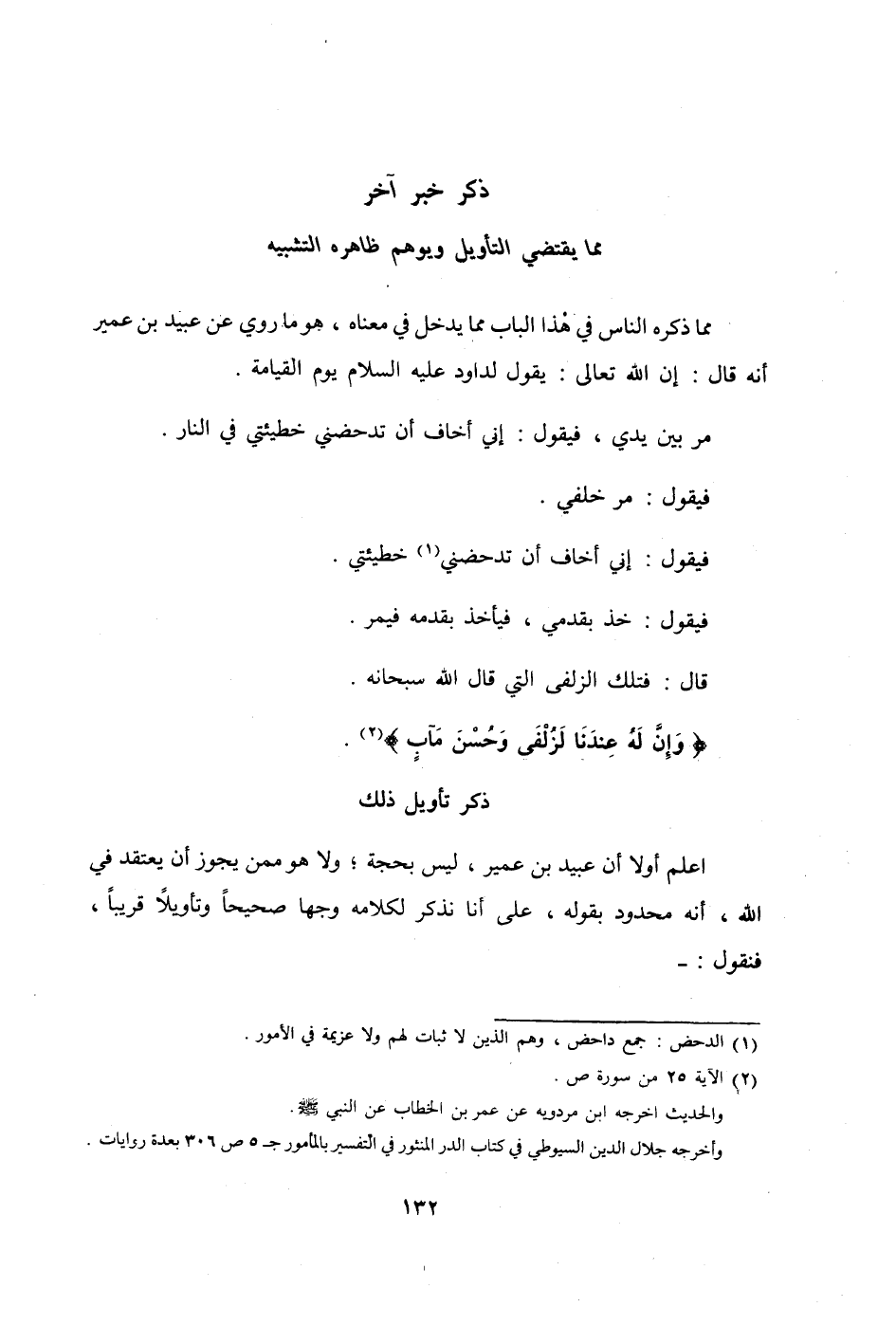 ذكر خبر آخر مِمَّا يَقْتَضِي التَّأْوِيل ويوهم ظَاهره التَّشْبِيه