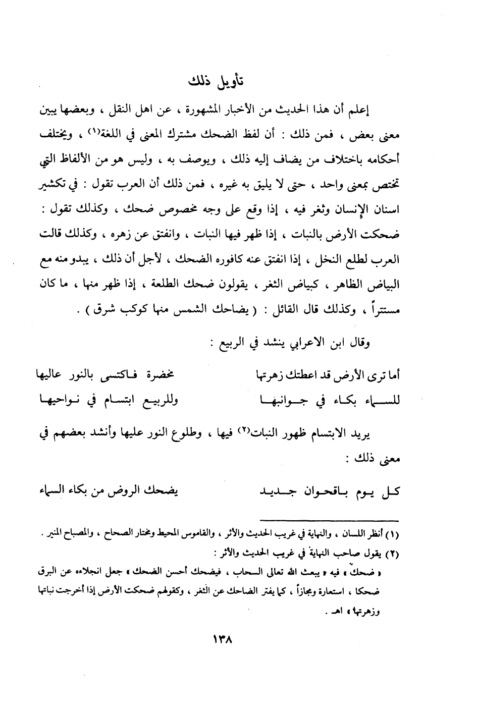 إعلم أَن هَذَا الحَدِيث من الْأَخْبَار الْمَشْهُورَة عَن أهل النَّقْل وَبَعضهَا يبين معنى بعض فَمن ذَلِك أَن لفظ الضحك مُشْتَرك الْمَعْنى فِي اللُّغَة وَيخْتَلف أَحْكَامه بإختلاف من يُضَاف إِلَيْهِ ذَلِك ويوصف بِهِ وَلَيْسَ هُوَ من الْأَلْفَاظ الَّتِي تخْتَص بِمَعْنى وَاحِد حَتَّى لَا يَلِيق بِهِ غَيره فَمن ذَلِك أَن الْعَرَب تَقول فِي تكشير أَسْنَان الْإِنْسَان وثغر فِيهِ إِذا وَقع على وَجه مَخْصُوص ضحك وَكَذَلِكَ تَقول ضحِكت الأَرْض بالنبات إِذا ظهر فِيهَا النَّبَات وانفتق عَن زهره وَكَذَلِكَ قَالَت الْعَرَب لطلع النّخل إِذا انفتق عَنهُ كافوره الضحك لأجل أَن ذَلِك يَبْدُو مِنْهُ مَعَ الْبيَاض الظَّاهِر كبياض الثغر يَقُولُونَ ضحك الطلعة إِذا ظهر مِنْهَا مَا كَانَ مستترا وَكَذَلِكَ قَالَ الْقَائِل يضاحك الشَّمْس مِنْهَا كَوْكَب شَرق