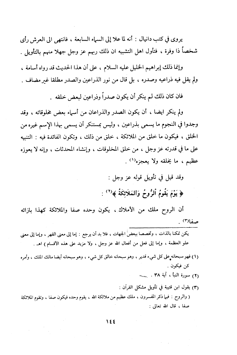 يرْوى فِي كتب دانيال أَنه لما علا إِلَى السَّمَاء السَّابِعَة فَانْتهى إِلَى الْعَرْش رأى شخصا ذَا وفرة فتأول أهل التَّشْبِيه أَن ذَلِك رَبهم عز وَجل جهلا مِنْهُم بالتأويل