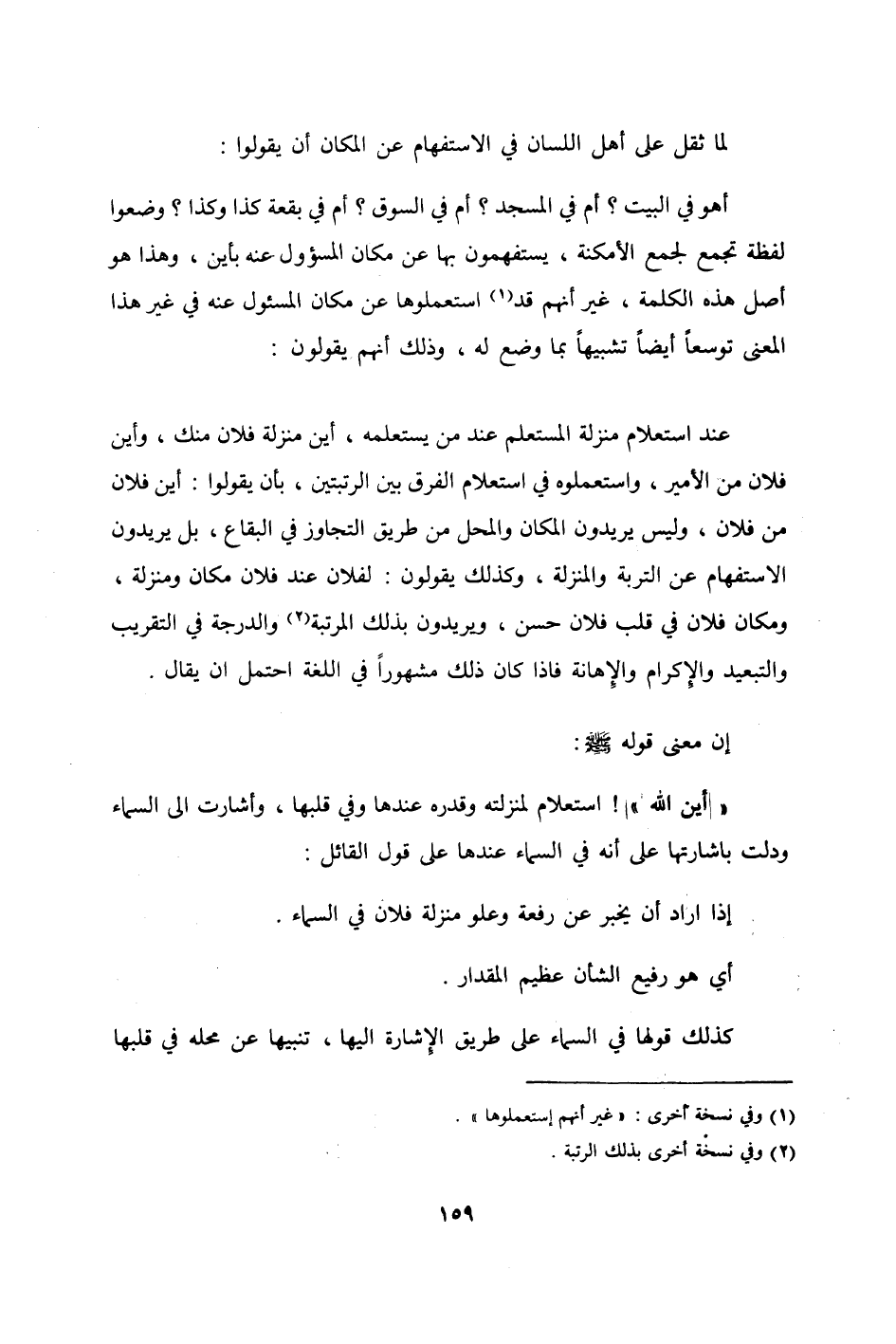 عِنْد استعلام منزلَة المستعلم عِنْد من يستعلمه أَيْن منزلَة فلَان مِنْك وَأَيْنَ فلَان من الْأَمِير واستعملوه فِي إستعلام الْفرق بَين الرتبتين بِأَن يَقُولُوا أَيْن فلَان من فلَان وَلَيْسَ يُرِيدُونَ الْمَكَان وَالْمحل من طَرِيق التجاوز فِي الْبِقَاع بل يُرِيدُونَ الإستفهام عَن التربة والمنزلة وَكَذَلِكَ يَقُولُونَ لفُلَان عِنْد فلَان مَكَان ومنزلة وَمَكَان فلَان فِي قلب فلَان حسن ويريدون بذلك الْمرتبَة والدرجة فِي التَّقْرِيب والتبعيد وَالْإِكْرَام والإهانة فَإِذا كَانَ ذَلِك مَشْهُورا فِي اللُّغَة احْتمل أَن يُقَال