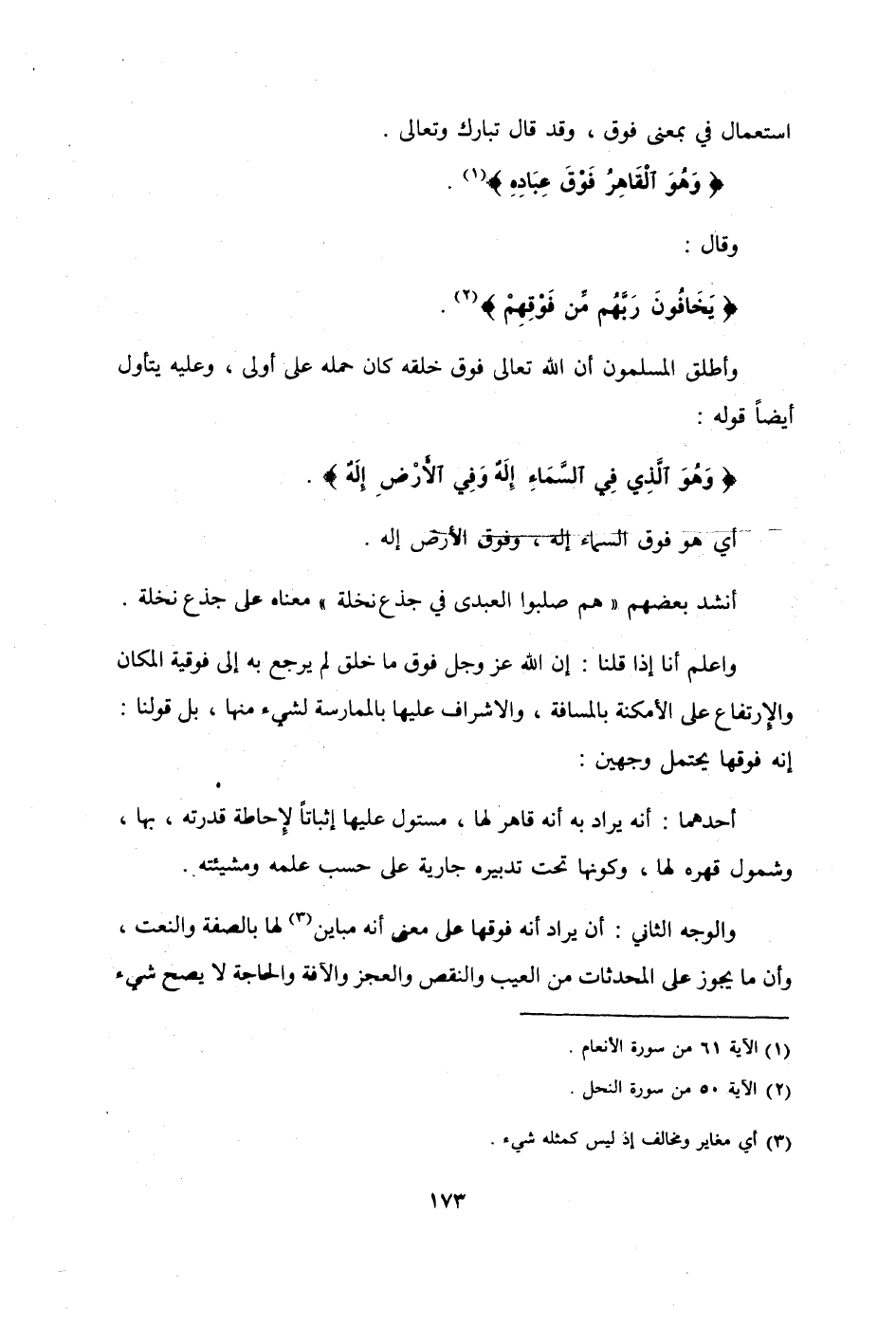 وَاعْلَم أَنا إِذا قُلْنَا إِن الله عز وَجل فَوق مَا خلق لم يرجع بِهِ إِلَى فوقية الْمَكَان والإرتفاع على الْأَمْكِنَة بالمسافة والإشراف عَلَيْهَا بالممارسة لشَيْء مِنْهَا بل قَوْلنَا إِنَّه فَوْقهَا يحْتَمل وَجْهَيْن