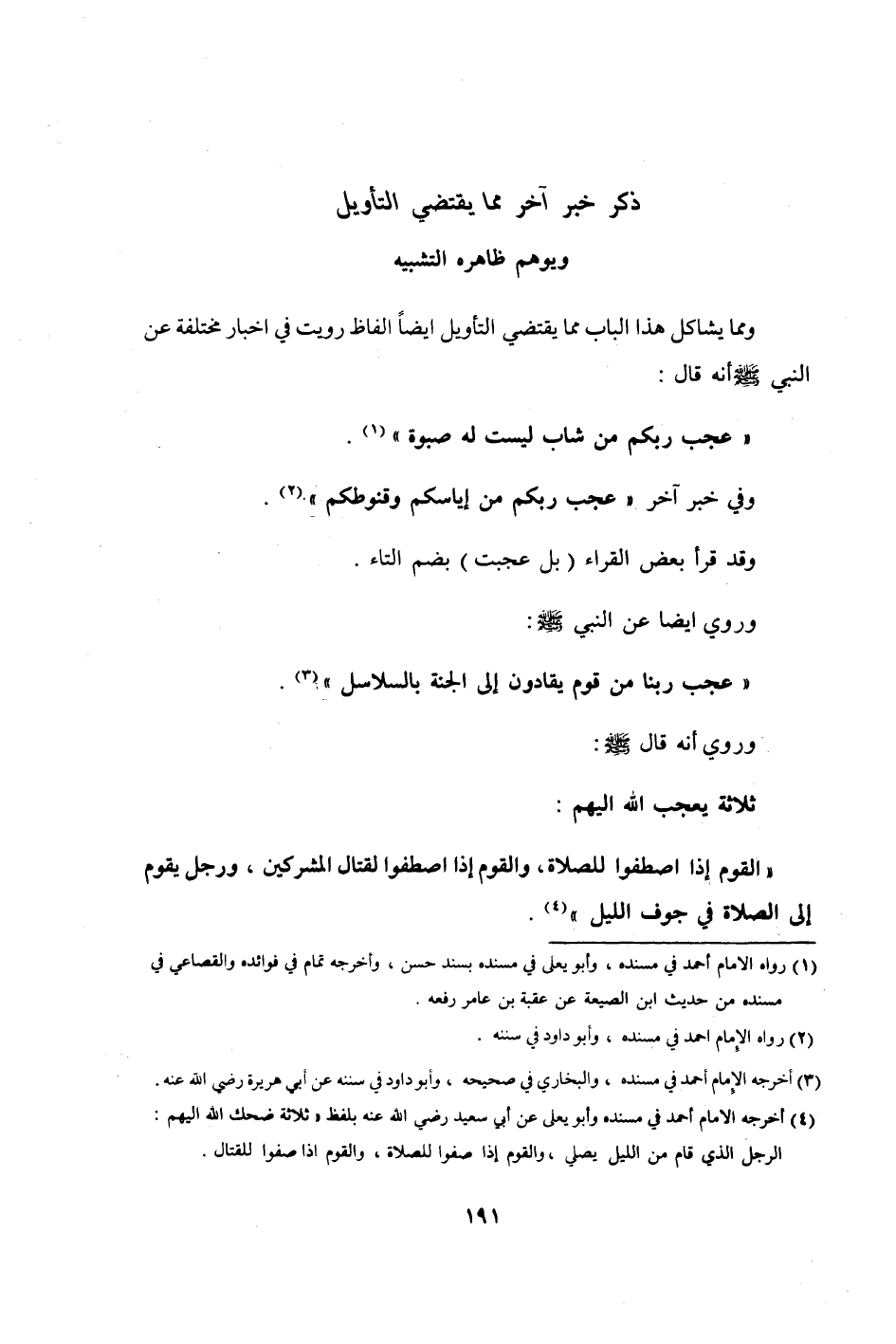 وَمِمَّا يشاكل هَذَا الْبَاب مِمَّا يَقْتَضِي التَّأْوِيل أَيْضا أَلْفَاظ رويت فِي أَخْبَار مُخْتَلفَة عَن النَّبِي صلى الله عَلَيْهِ وَسلم أَنه قَالَ