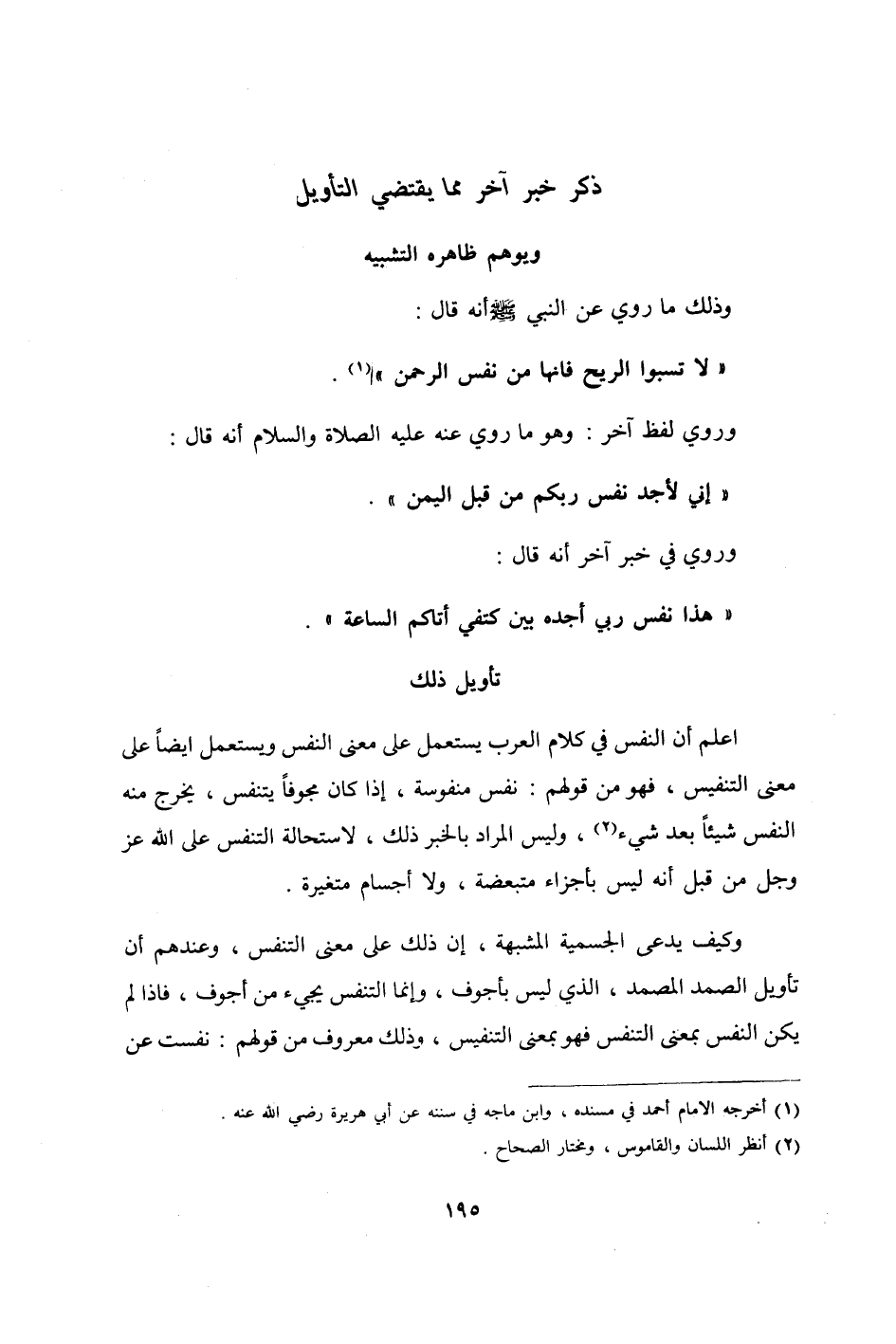 وَكَيف يَدعِي الجسمية المشبهة إِن ذَلِك على معنى التنفس وَعِنْدهم أَن تَأْوِيل الصمت المصمد الَّذِي لَيْسَ بأجوف وَإِنَّمَا التنفس يَجِيء من أجوف فَإِذا لم يكن النَّفس بِمَعْنى التنفس فَهُوَ بِمَعْنى التَّنْفِيس وَذَلِكَ مَعْرُوف من قَوْلهم نفست عَن
