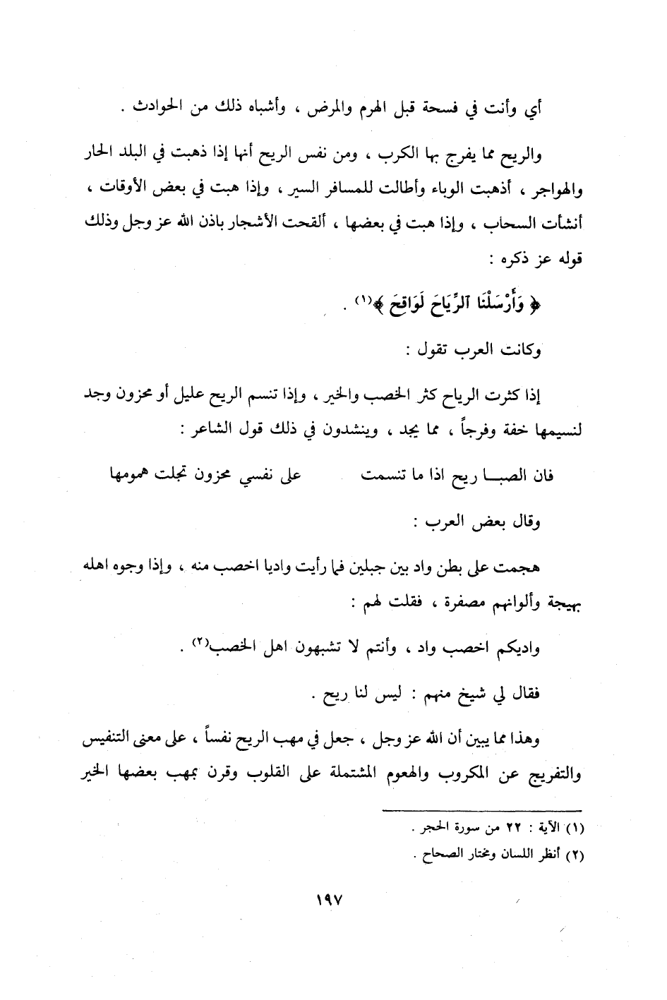 وَالرِّيح مِمَّا يفرج بهَا الكرب وَمن نفس الرّيح أَنَّهَا إِذا ذهبت فِي الْبَلَد الْحَار والهواجر أذهبت الوباء وأطالت للْمُسَافِر السّير وَإِذا هبت فِي بعض الْأَوْقَات أنشأت السَّحَاب وَإِذا هبت فِي بَعْضهَا ألقحت الْأَشْجَار بِإِذن الله عز وَجل وَذَلِكَ قَوْله عز ذكره {وَأَرْسَلْنَا الرِّيَاح لَوَاقِح}
