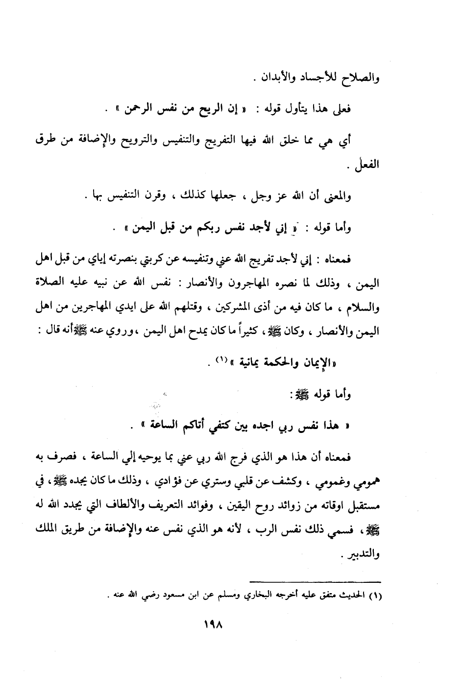 فَمَعْنَاه أَن هَذَا هُوَ الَّذِي فرج الله رَبِّي عني بِمَا يوحيه إِلَيّ السَّاعَة فصرف بِهِ همومي وغمومي وكشف عَن قلبِي وستري عَن فُؤَادِي وَذَلِكَ مَا كَانَ يجده صلى الله عَلَيْهِ وَسلم فِي مُسْتَقْبل أوقاته من زَوَائِد روح الْيَقِين وفوائد التَّعْرِيف والألطاف الَّتِي يجدد الله لَهُ صلى الله عَلَيْهِ وَسلم فَسُمي ذَلِك نفس الرب لِأَنَّهُ هُوَ الَّذِي نفس عَنهُ وَالْإِضَافَة من طَرِيق الْملك وَالتَّدْبِير