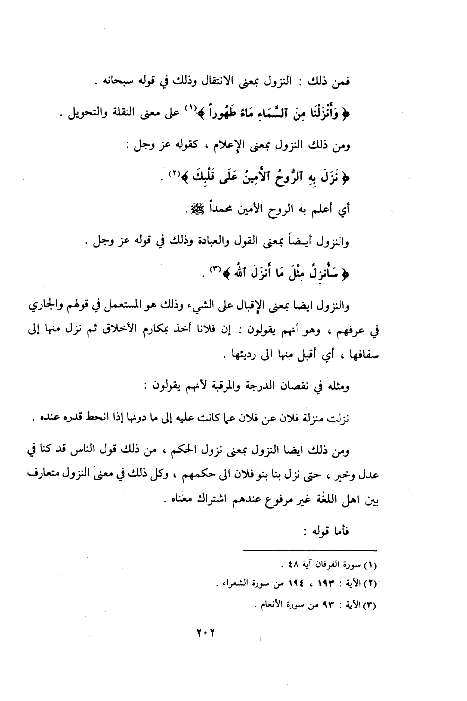 وَمن ذَلِك أَيْضا النُّزُول بِمَعْنى نزُول الحكم من ذَلِك قَول النَّاس قد كُنَّا فِي عدل وَخير حَتَّى نزل بِنَا بَنو فلَان إِلَى حكمهم وكل ذَلِك فِي معنى النُّزُول مُتَعَارَف بَين أهل اللُّغَة غير مَرْفُوع عِنْدهم اشْتِرَاك مَعْنَاهُ