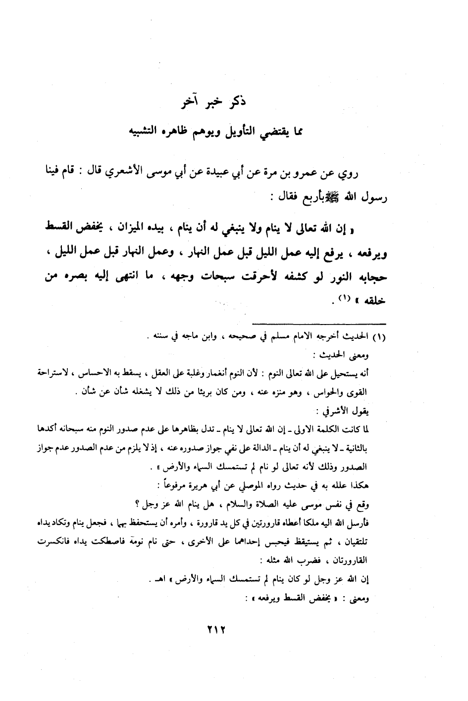 إِن الله تَعَالَى لَا ينَام وَلَا يَنْبَغِي لَهُ أَن ينَام بِيَدِهِ الْمِيزَان يخْفض الْقسْط وَيَرْفَعهُ يرفع إِلَيْهِ عمل اللَّيْل قبل عمل النَّهَار وَعمل النَّهَار قبل عمل اللَّيْل حجابه النُّور لَو كشفه لأحرقت سبحات وَجهه مَا انْتهى إِلَيْهِ بَصَره من خلقه // أخرجه الإِمَام مُسلم //