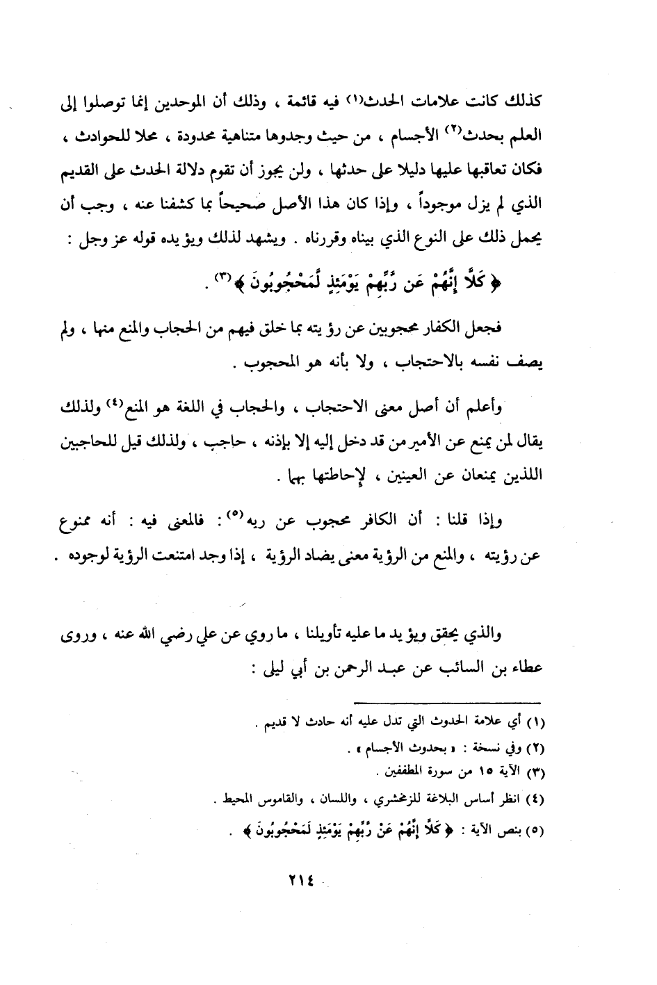 كَذَلِك كَانَت عَلَامَات الْحَدث فِيهِ قَائِمَة وَذَلِكَ أَن الْمُوَحِّدين إِنَّمَا توصلوا إِلَى الْعلم بِحَدَث الْأَجْسَام من حَيْثُ وجدوها متناهية محدودة محلا للحوادث فَكَانَ تعاقبها عَلَيْهَا دَلِيلا على حدثها وَلنْ يجوز أَن تقوم دلَالَة الْحَدث على الْقَدِيم الَّذِي لم يزل مَوْجُودا وَإِذا كَانَ هَذَا الأَصْل صَحِيحا بِمَا كشفنا عَنهُ وَجب أَن يحمل ذَلِك على النَّوْع الَّذِي بَيناهُ وقررناه وَيشْهد لذَلِك يُؤَيّدهُ قَوْله عز وَجل {كلا إِنَّهُم عَن رَبهم يَوْمئِذٍ لمحجوبون}