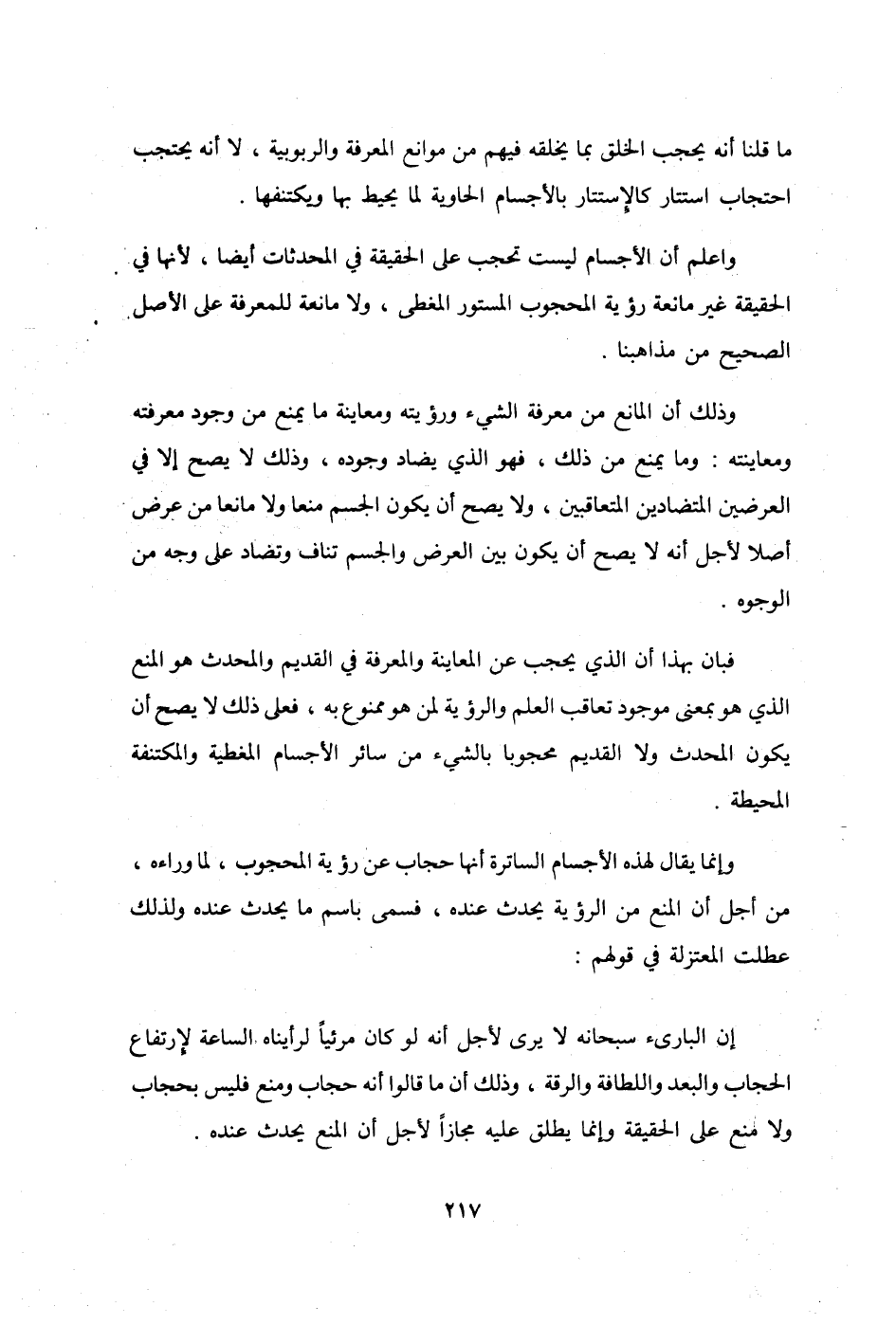 إِن البارئ سُبْحَانَهُ لَا يرى لأجل أَنه لَو كَانَ مرئيا لرأيناه السَّاعَة لإرتفاع الْحجاب والبعد واللطافة والرقة وَذَلِكَ أَن مَا قَالُوا أَنه حجاب وَمنع فَلَيْسَ بحجاب وَلَا منع على الْحَقِيقَة وَإِنَّمَا يُطلق عَلَيْهِ مجَازًا لأجل أَن الْمَنْع يحدث عِنْده
