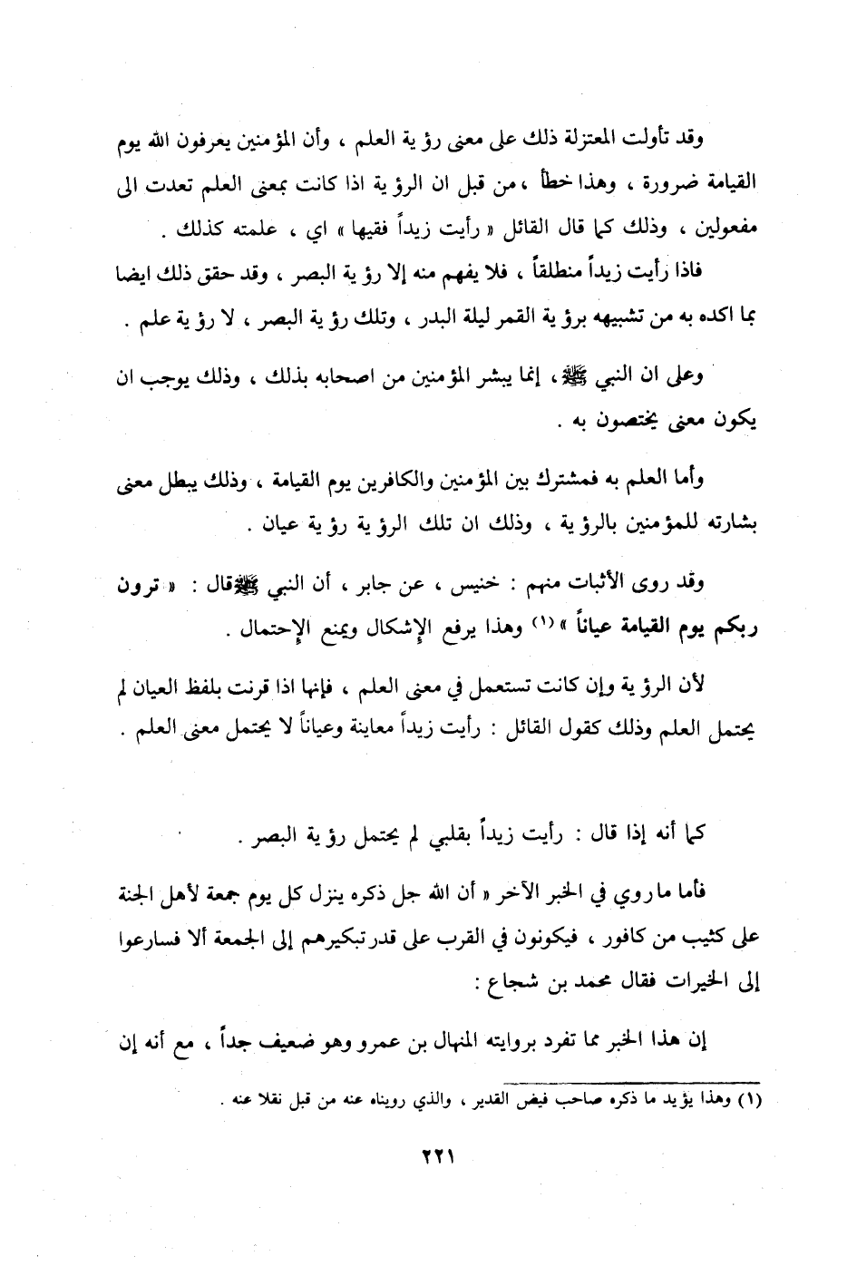وَقد تأولت الْمُعْتَزلَة ذَلِك على معنى رُؤْيَة الْعلم وَأَن الْمُؤمنِينَ يعْرفُونَ الله يَوْم الْقِيَامَة ضَرُورَة وَهَذَا خطأ من قبل أَن الرُّؤْيَة إِذا كَانَت بِمَعْنى الْعلم تعدت إِلَى مفعولين وَذَلِكَ كَمَا قَالَ الْقَائِل رَأَيْت زيدا فَقِيها أَي عَلمته كَذَلِك