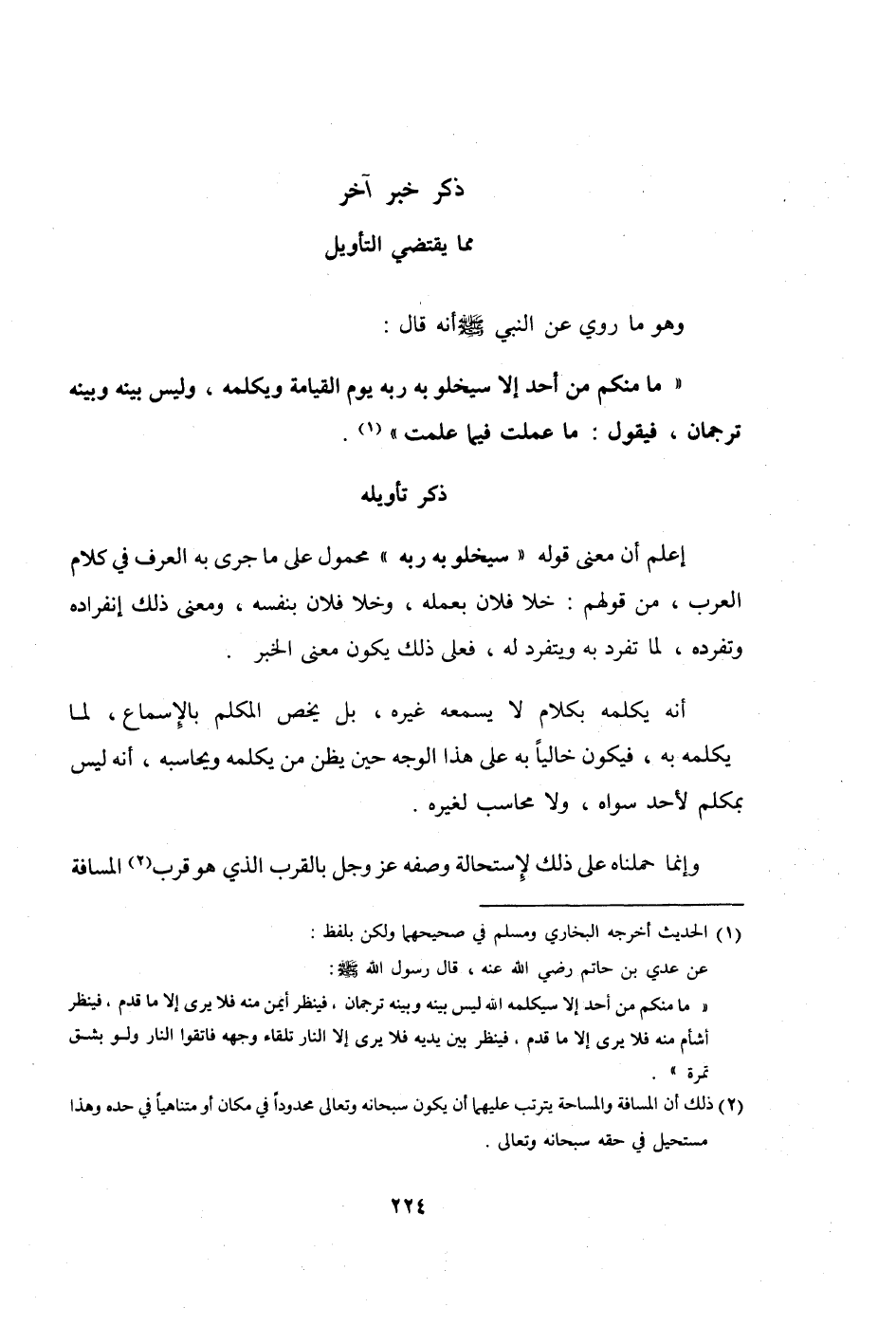 مَا مِنْكُم من أحد إِلَّا سيخلو بِهِ ربه يَوْم الْقِيَامَة ويكلمه وَلَيْسَ بَينه وَبَينه ترجمان فَيَقُول مَا عملت فِيمَا علمت // أخرجه البُخَارِيّ //