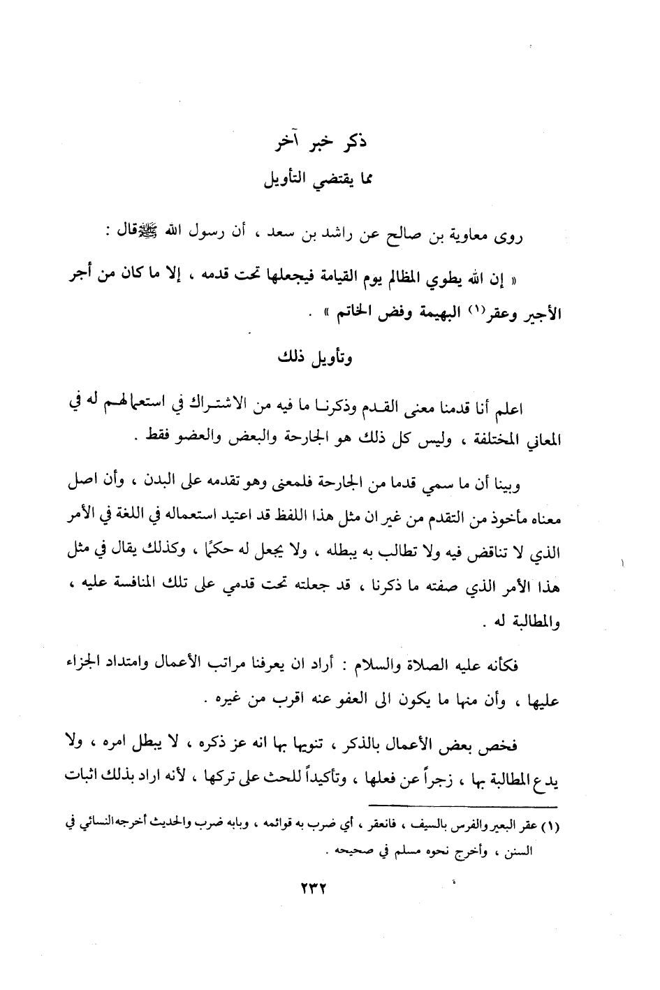 وَبينا أَن مَا سمي قدما من الْجَارِحَة فلمعنى وَهُوَ تقدمه على الْبدن وَأَن أصل مَعْنَاهُ مَأْخُوذ من التَّقَدُّم من غير أَن مثل هَذَا اللَّفْظ قد اُعْتِيدَ اسْتِعْمَاله فِي اللُّغَة فِي الْأَمر الَّذِي لَا تنَاقض فِيهِ وَلَا تطالب بِهِ يُبطلهُ ولايجعل لَهُ حكما وَكَذَلِكَ يُقَال فِي مثل هَذَا الْأَمر الَّذِي صفته مَا ذكرنَا قد جعلته تَحت قدمي على تِلْكَ المنافسة عَلَيْهِ والمطالبة لَهُ