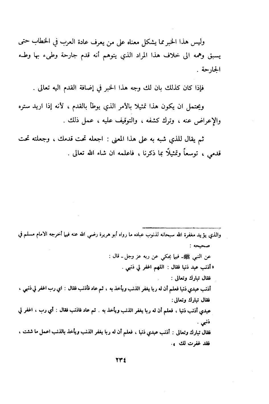 وَلَيْسَ هَذَا الْخَبَر مِمَّا يشكل مَعْنَاهُ على من يعرف عَادَة الْعَرَب فِي الْخطاب حَتَّى يسْبق وهمه إِلَى خلاف هَذَا المُرَاد الَّذِي يتَوَهَّم أَنه قدم جارحة وطئ بهَا وَطْء الْجَارِحَة