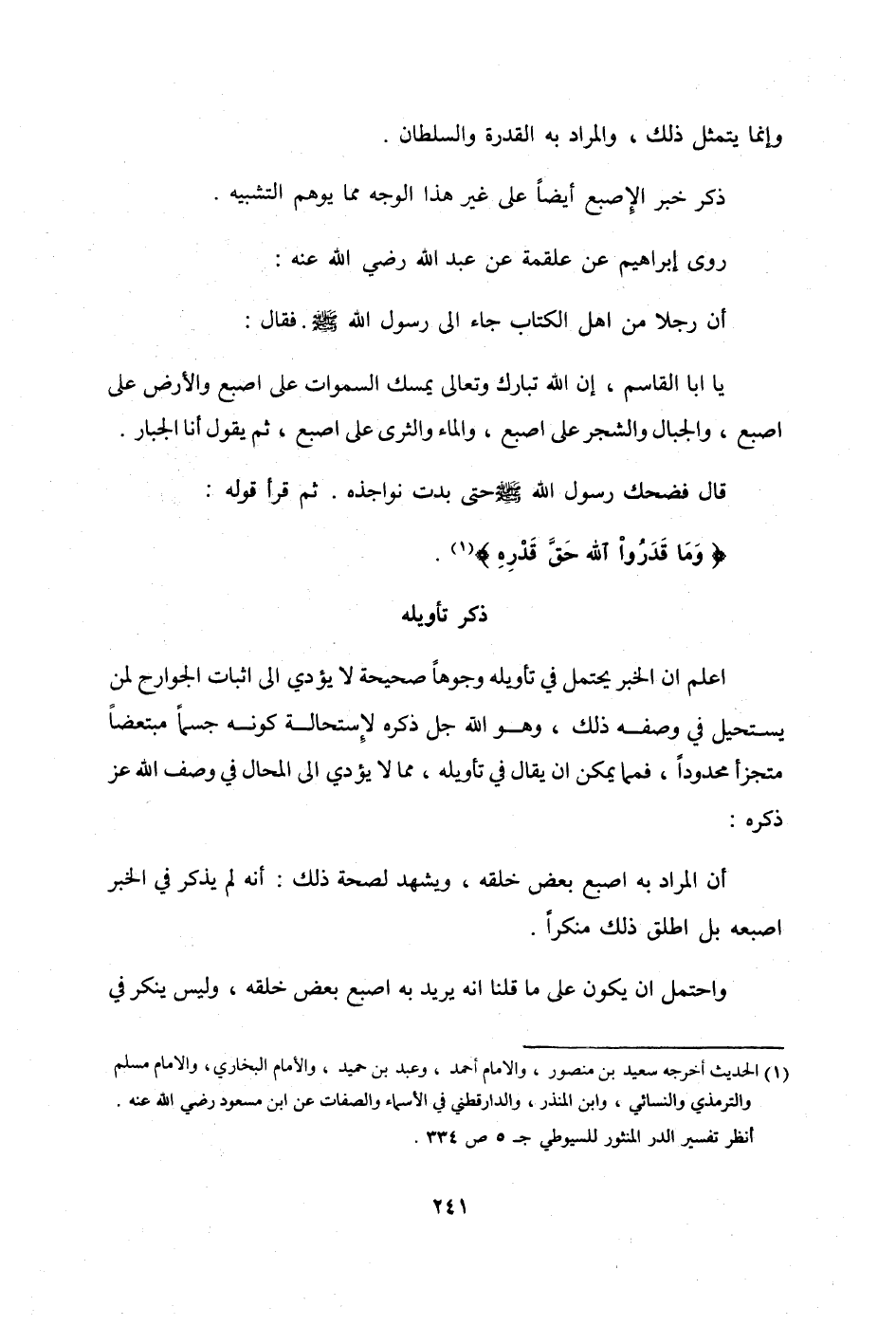 قَالَ فَضَحِك رَسُول الله صلى الله عَلَيْهِ وَسلم حَتَّى بَدَت نَوَاجِذه ثمَّ قَرَأَ قَوْله {وَمَا قدرُوا الله حق قدره} // أخرجه سعيد بن مَنْصُور //