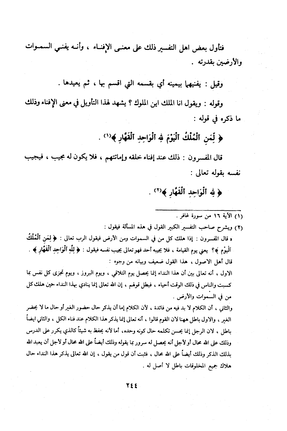 وَقَوله وَيَقُول أَنا الْملك أَيْن الْمُلُوك يشْهد لهَذَا التَّأْوِيل فِي معنى الإفناء وَذَلِكَ مَا ذكره فِي قَوْله {لمن الْملك الْيَوْم لله الْوَاحِد القهار}