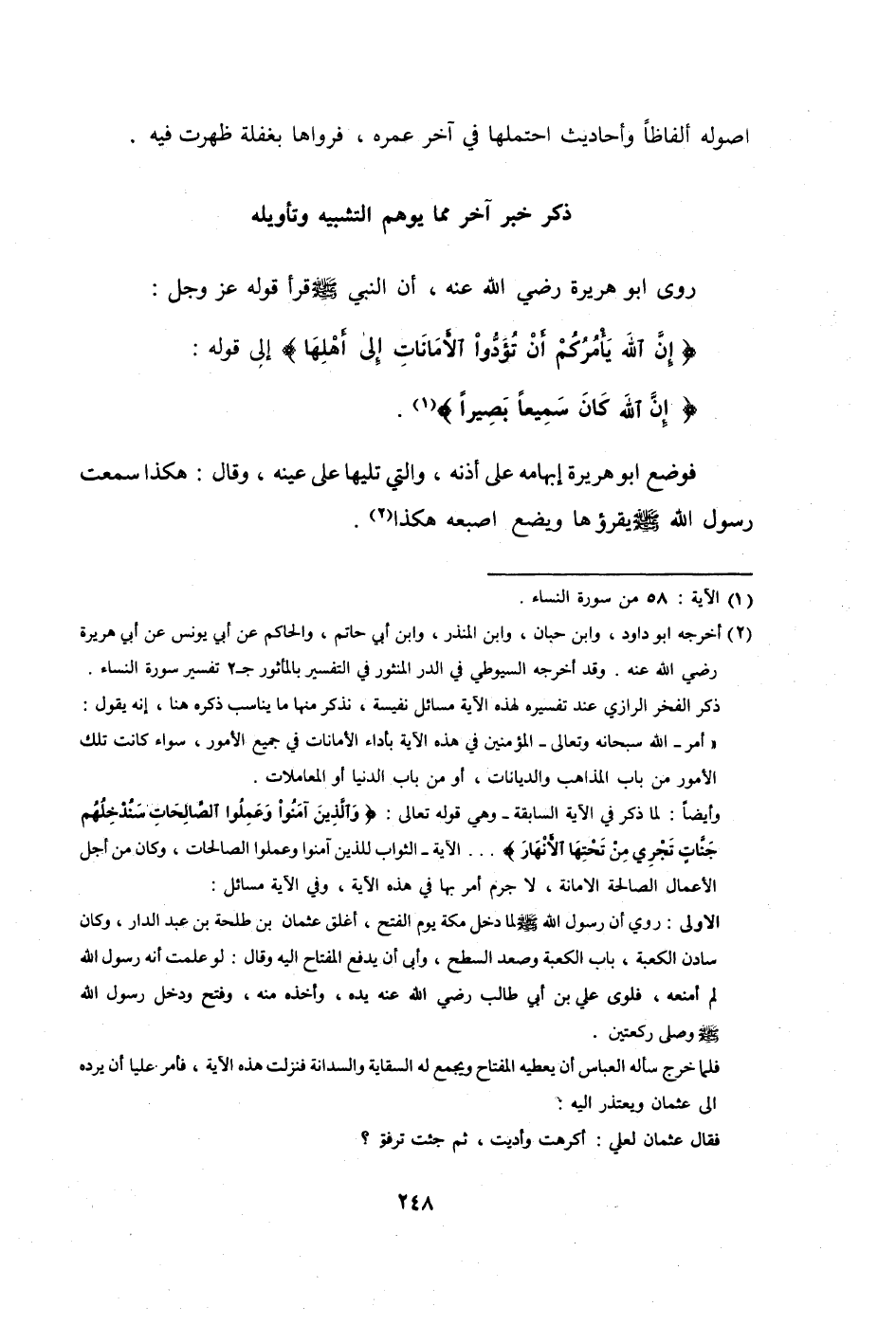 روى أَبُو هُرَيْرَة رَضِي الله عَنهُ أَن النَّبِي صلى الله عَلَيْهِ وَسلم قَرَأَ قَوْله عز وَجل {إِن الله يَأْمُركُمْ أَن تُؤَدُّوا الْأَمَانَات إِلَى أَهلهَا} إِلَى قَوْله {إِن الله كَانَ سميعا بَصيرًا}