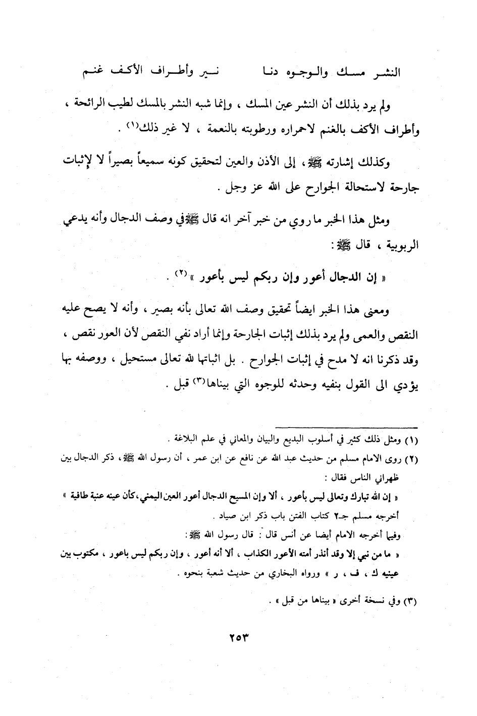 وَمعنى هَذَا الْخَبَر أَيْضا تَحْقِيق وصف الله تَعَالَى بِأَنَّهُ بَصِير وَأَنه لَا يَصح عَلَيْهِ النَّقْص والعمى وَلم يرد بذلك إِثْبَات الْجَارِحَة وَإِنَّمَا أَرَادَ نفي النَّقْص لِأَن العور نقص وَقد ذكرنَا أَنه لَا مدح فِي إِثْبَات الْجَوَارِح بل إِثْبَاتهَا لله تَعَالَى مُسْتَحِيل وَوَصفه بهَا يُؤَدِّي إِلَى القَوْل بنفيه وحدثه للوجوه الَّتِي بيناها قبل