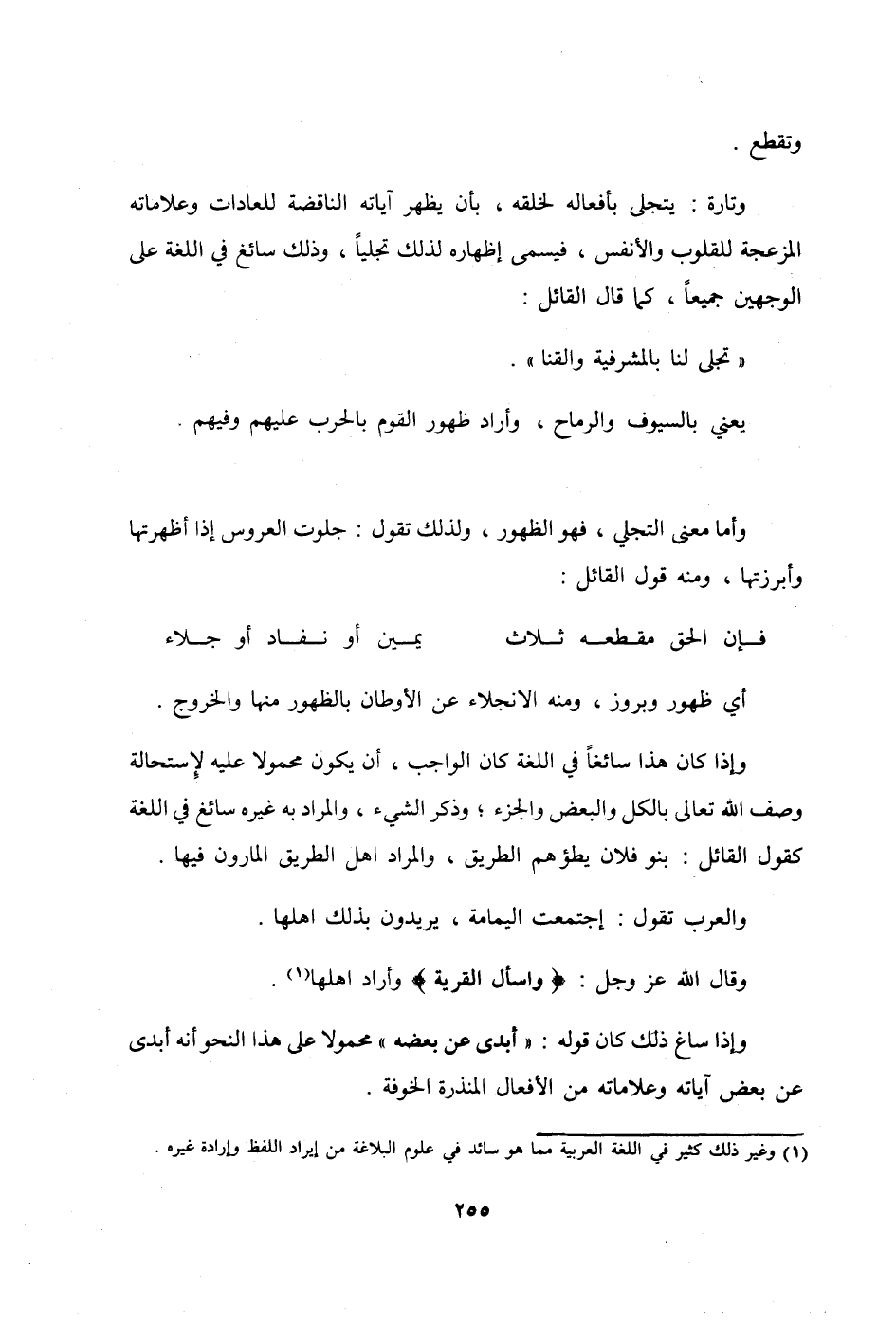 وَتارَة يتجلى بأفعاله لخلقه بِأَن يظْهر آيَاته الناقضة للعادات وعلاماته المزعجة للقلوب والأنفس فيسمى إِظْهَاره لذَلِك تجليا وَذَلِكَ سَائِغ فِي اللُّغَة على الْوَجْهَيْنِ جَمِيعًا كَمَا قَالَ الْقَائِل