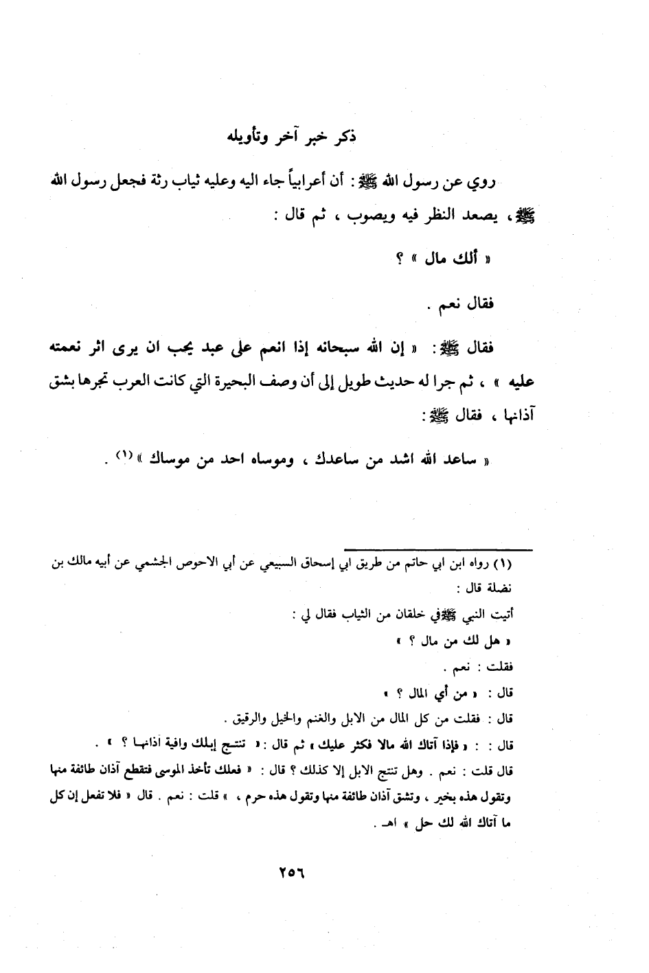 فَقَالَ صلى الله عَلَيْهِ وَسلم إِن الله سُبْحَانَهُ إِذا أنعم على عبد يحب أَن يرى أثر نعْمَته عَلَيْهِ ثمَّ جرا لَهُ حَدِيث طَوِيل إِلَى أَن وصف الْبحيرَة الَّتِي كَانَت الْعَرَب تجرها بشق آذانها فَقَالَ صلى الله عَلَيْهِ وَسلم