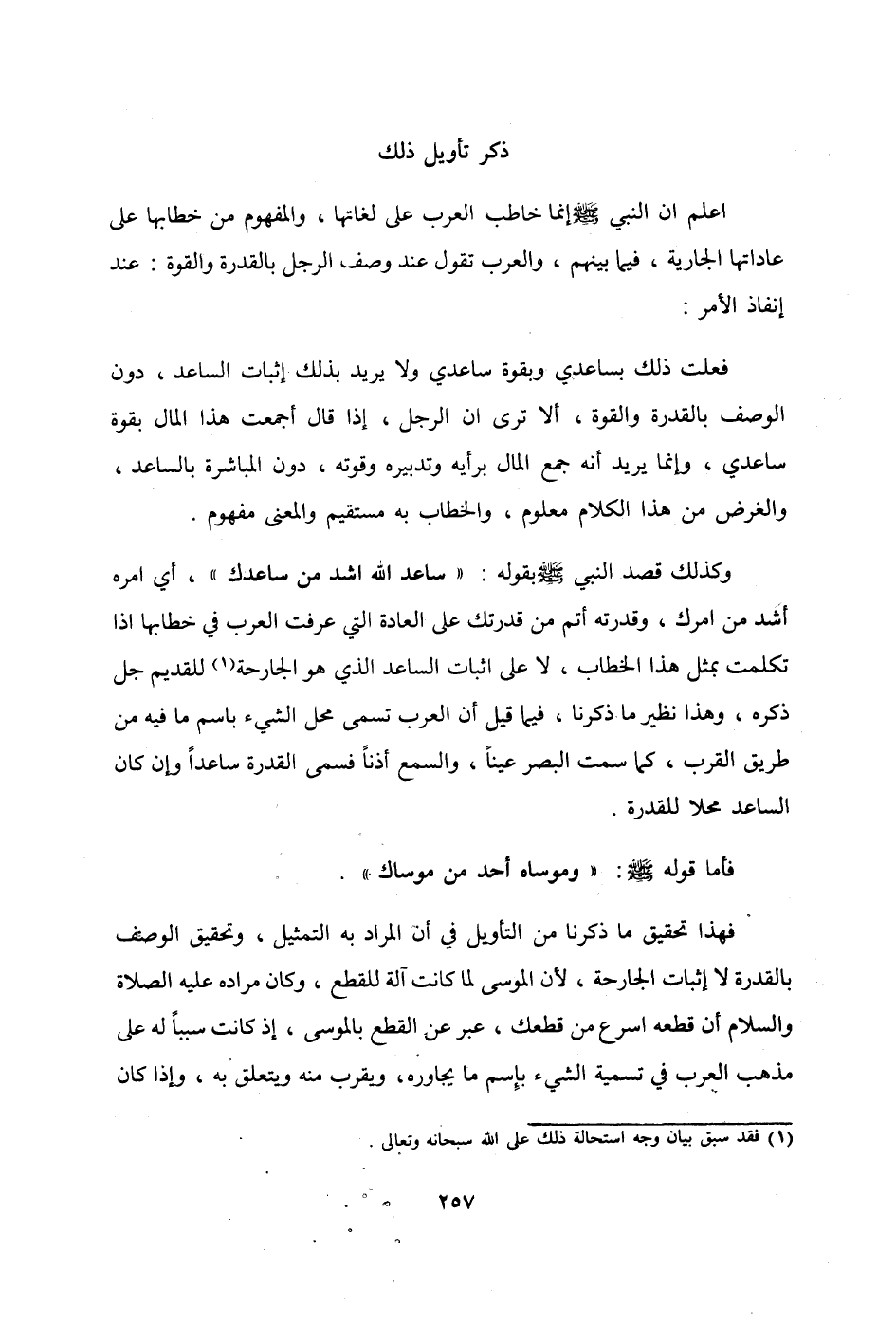 فعلت ذَلِك بساعدي وبقوة ساعدي وَلَا يُرِيد بذلك إِثْبَات الساعد دون الْوَصْف بِالْقُدْرَةِ وَالْقُوَّة أَلا ترى أَن الرجل إِذا قَالَ أَجمعت هَذَا المَال بِقُوَّة ساعدي وَإِنَّمَا يُرِيد أَنه جمع المَال بِرَأْيهِ وتدبيره وقوته دون الْمُبَاشرَة بالساعد وَالْغَرَض من هَذَا الْكَلَام مَعْلُوم وَالْخطاب بِهِ مُسْتَقِيم وَالْمعْنَى مَفْهُوم