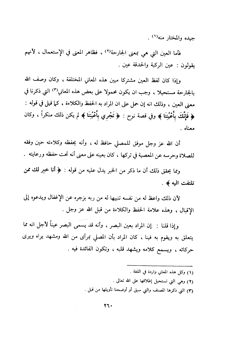وَإِذا كَانَ لفظ الْعين مُشْتَركا مُبين هَذِه الْمعَانِي الْمُخْتَلفَة وَكَانَ وصف الله بالجارحة مستحيلا وَجب أَن يكون مَحْمُولا على بعض هَذِه الْمعَانِي الَّتِي ذكرنَا فِي معنى الْعين وَذَلِكَ أَنه إِن حمل على أَن المُرَاد بِهِ الْحِفْظ والكلاءة كَمَا قيل فِي قَوْله {فَإنَّك بأعيننا} وَفِي قصَّة نوح {تجْرِي بأعيننا} لم يكن ذَلِك مُنْكرا وَكَانَ مَعْنَاهُ