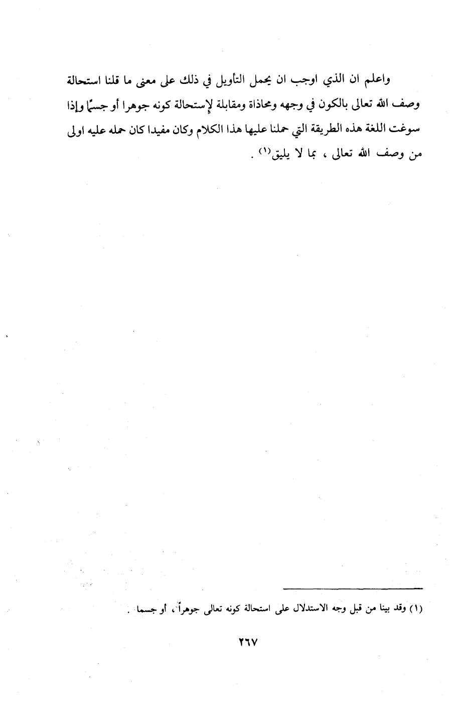 وَأعلم أَن الَّذِي أوجب أَن يحمل التَّأْوِيل فِي ذَلِك على معنى مَا قُلْنَا إستحالة وصف الله تَعَالَى بالكون فِي وَجهه ومحاذاة ومقابلة لإستحالة كَونه جوهرا أَو جسما وَإِذا سوغت اللُّغَة هَذِه الطَّرِيقَة الَّتِي حملنَا عَلَيْهَا هَذَا الْكَلَام وَكَانَ مُفِيدا كَانَ حمله عَلَيْهِ أولى من وصف الله تَعَالَى بِمَا لَا يَلِيق