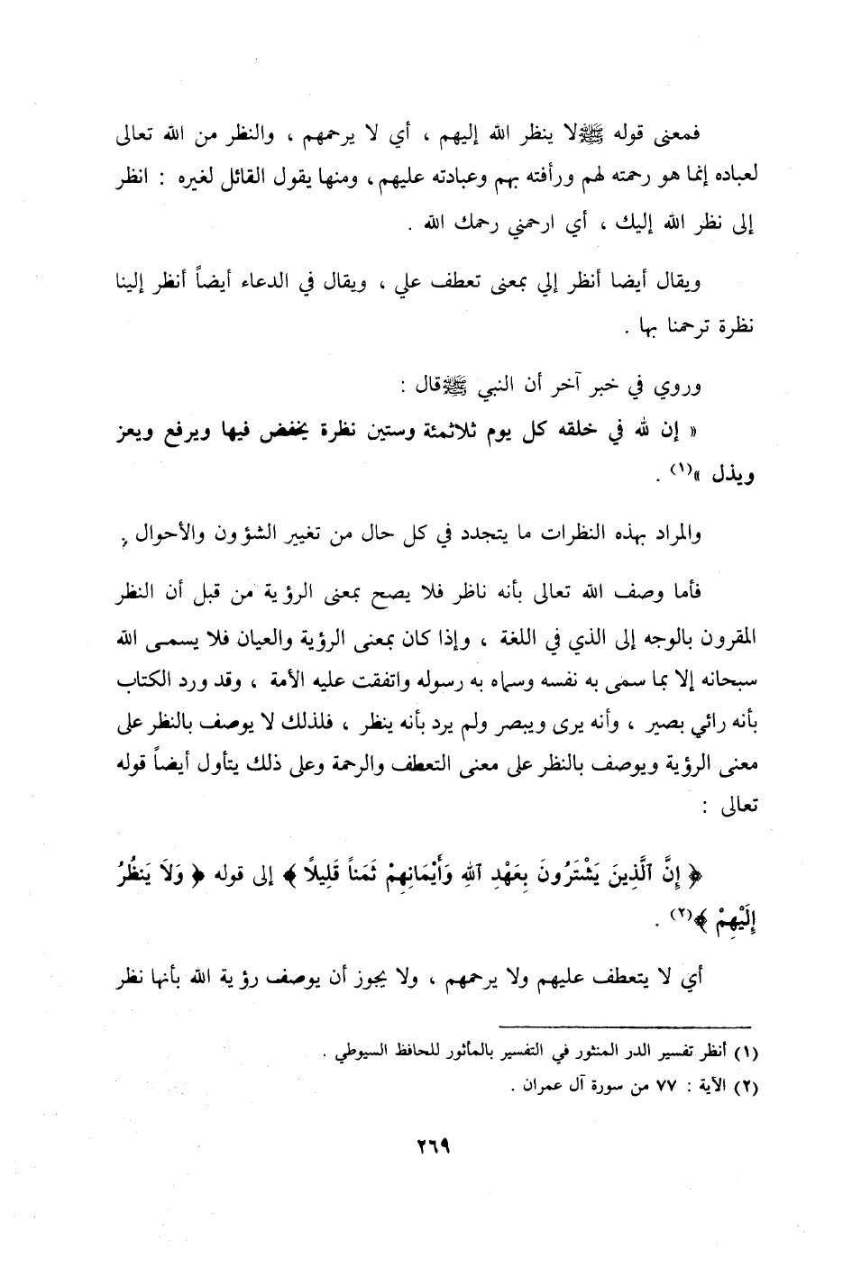 فَأَما وصف الله تَعَالَى بِأَنَّهُ نَاظر فَلَا يَصح بِمَعْنى الرُّؤْيَة من قبل أَن النّظر المقرون بِالْوَجْهِ إِلَى الَّذِي فِي اللُّغَة وَإِذا كَانَ بِمَعْنى الرُّؤْيَة والعيان فَلَا يُسمى الله سُبْحَانَهُ إِلَّا بِمَا سمى بِهِ نَفسه وَسَماهُ بِهِ رَسُوله واتفقت عَلَيْهِ الْأمة وَقد ورد الْكتاب بِأَنَّهُ رائي بَصِير وَأَنه يرى ويبصر وَلم يرد بِأَنَّهُ ينظر فَلذَلِك لَا يُوصف بِالنّظرِ على معنى الرُّؤْيَة ويوصف بِالنّظرِ على معنى التعطف وَالرَّحْمَة وعَلى ذَلِك يتَأَوَّل أَيْضا قَوْله تَعَالَى {إِن الَّذين يشْتَرونَ بِعَهْد الله وَأَيْمَانهمْ ثمنا قَلِيلا} إِلَى قَوْله (وَلَا ينظر إِلَيْهِم)
