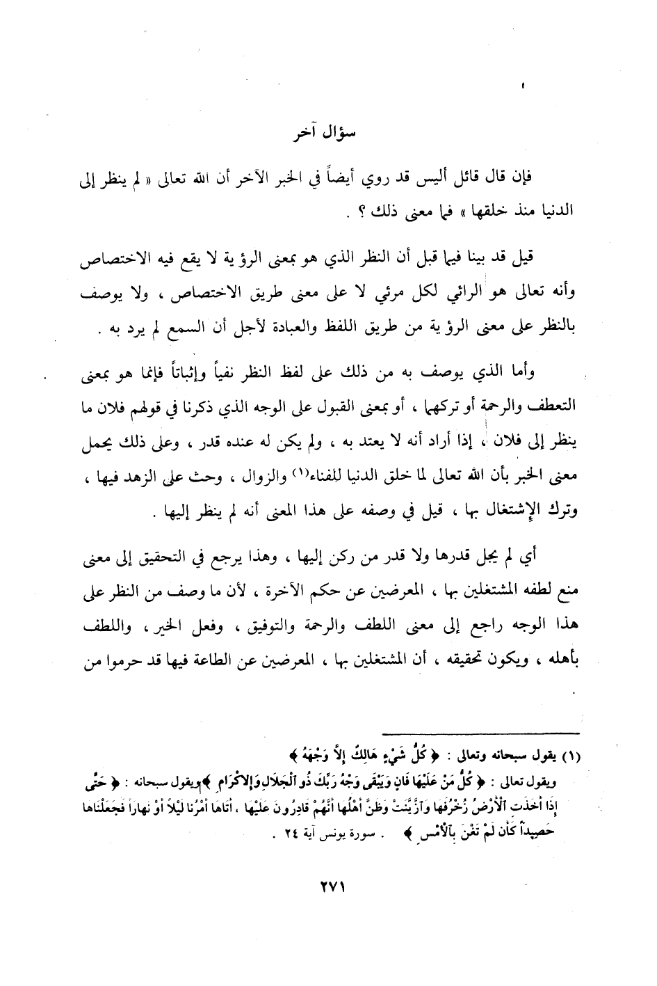 وَأما الَّذِي يُوصف بِهِ من ذَلِك على لفظ النّظر نفيا وإثباتا فَإِنَّمَا هُوَ بِمَعْنى التعطف وَالرَّحْمَة أَو تَركهمَا أَو بِمَعْنى الْقبُول على الْوَجْه الَّذِي ذكرنَا فِي قَوْلهم فلَان مَا ينظر إِلَى فلَان إِذا أَرَادَ أَنه لَا يعْتد بِهِ وَلم يكن لَهُ عِنْده قدر وعَلى ذَلِك يحمل معنى الْخَبَر بِأَن الله تَعَالَى لما خلق الدُّنْيَا للفناء والزوال وحث على الزّهْد فِيهَا وَترك الإشتغال بهَا قيل فِي وَصفه على هَذَا الْمَعْنى أَنه لم ينظر إِلَيْهَا