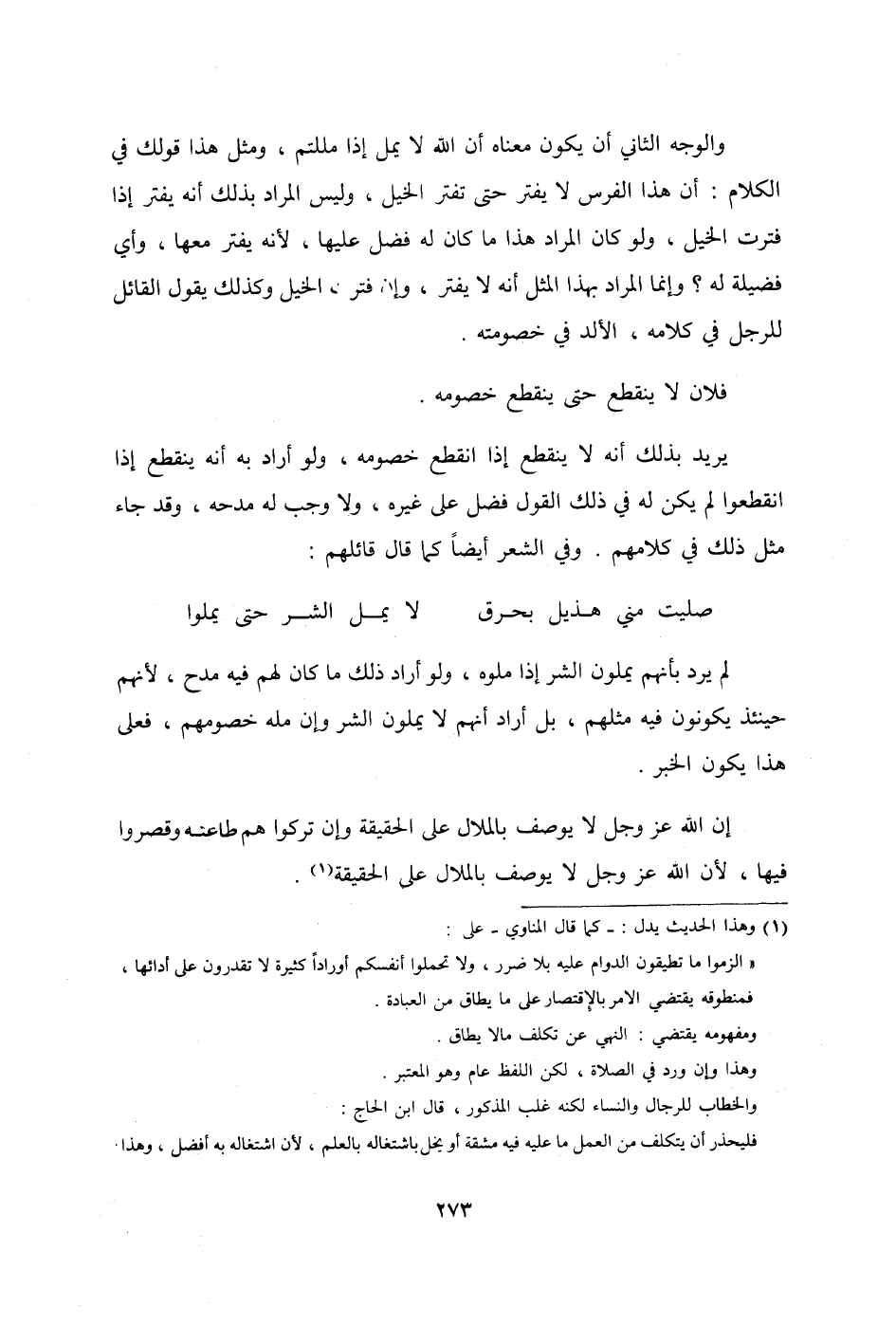 وَالْوَجْه الثَّانِي أَن يكون مَعْنَاهُ أَن الله لَا يمل إِذا مللتم وَمثل هَذَا قَوْلك فِي الْكَلَام أَن هَذَا الْفرس لَا يفتر حَتَّى تفتر الْخَيل وَلَيْسَ المُرَاد بذلك أَنه يفتر إِذا فترت الْخَيل وَلَو كَانَ المُرَاد هَذَا مَا كَانَ لَهُ فضل عَلَيْهَا لِأَنَّهُ يفتر مَعهَا وَأي فَضِيلَة لَهُ وَإِنَّمَا المُرَاد بِهَذَا الْمثل أَنه لَا يفتر وَإِن فتر الْخَيل وَكَذَلِكَ يَقُول الْقَائِل للرجل فِي كَلَامه الألد فِي خصومته