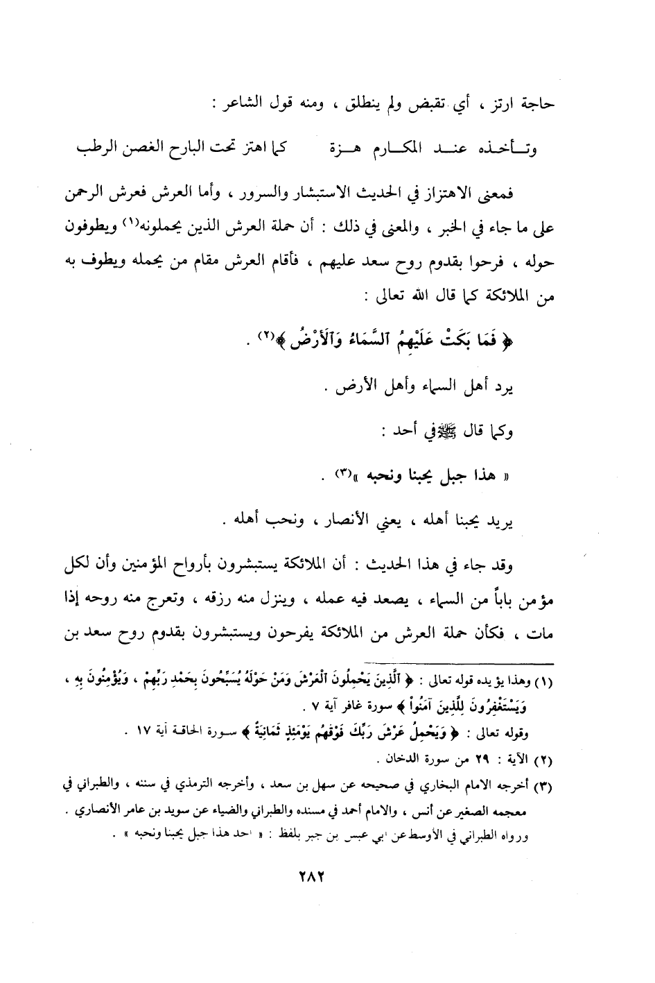 فَمَعْنَى الإهتزاز فِي الحَدِيث الإستبشار وَالسُّرُور وَأما الْعَرْش فعرش الرَّحْمَن على مَا جَاءَ فِي الْخَبَر وَالْمعْنَى فِي ذَلِك أَن حَملَة الْعَرْش الَّذين يحملونه ويطوفون حوله فرحوا بقدوم روح سعد عَلَيْهِم فَأَقَامَ الْعَرْش مقَام من يحملهُ وَيَطوف بِهِ من الْمَلَائِكَة كَمَا قَالَ الله تَعَالَى {فَمَا بَكت عَلَيْهِم السَّمَاء وَالْأَرْض}