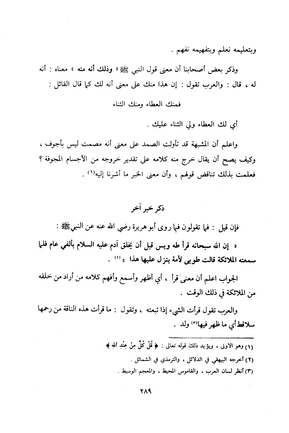 وَأعلم أَن المشبهة قد تأولت الصَّمد على معنى أَنه مصمت لَيْسَ بأجوف وَكَيف يَصح أَن يُقَال خرج مِنْهُ كَلَامه على تَقْدِير خُرُوجه من الْأَجْسَام المجوفة فَعلمت بذلك تنَاقض قَوْلهم وَأَن معنى الْخَبَر مَا أَشَرنَا إِلَيْهِ