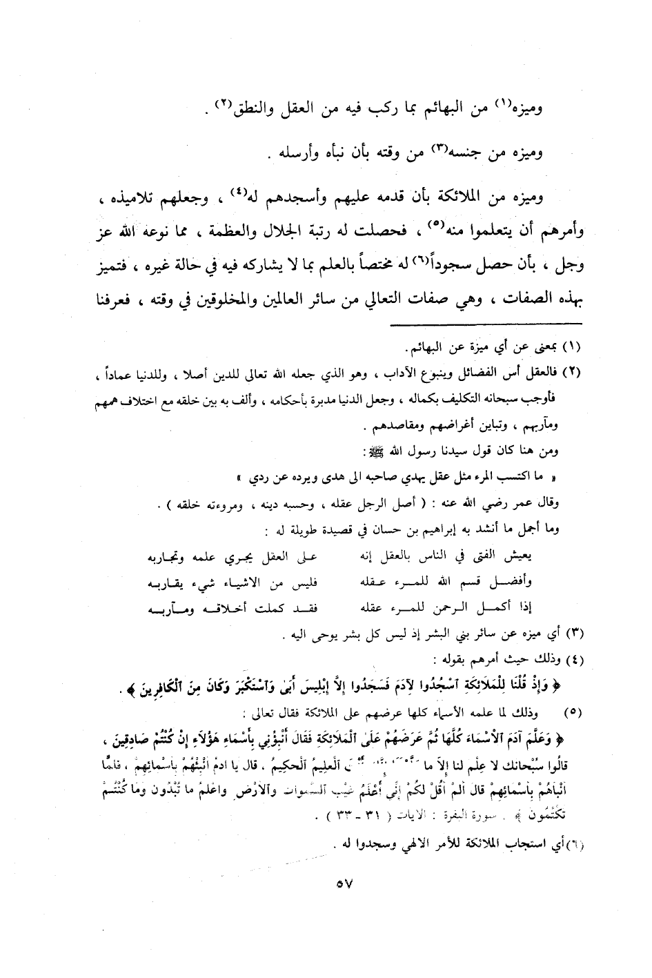وميزه من الْمَلَائِكَة بِأَن قدمه عَلَيْهِم وأسجدهم لَهُ وجعلهم تلاميذه وَأمرهمْ أَن يتعلموا مِنْهُ فحصلت لَهُ رُتْبَة الْجلَال وَالْعَظَمَة مِمَّا نَوعه الله عز وَجل بِأَن حصل سجودا لَهُ مُخْتَصًّا بِالْعلمِ بِمَا لَا يُشَارِكهُ فِيهِ فِي حَالَة غَيره فتميز بِهَذِهِ الصِّفَات وَهِي صِفَات التعالي من سَائِر الْعَالمين والمخلوقين فِي وقته فَعرفنَا