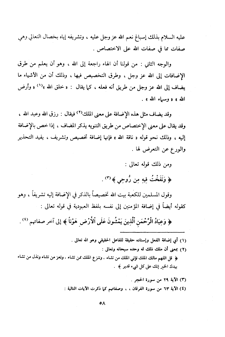 وَقد يُضَاف مثل هَذِه الْإِضَافَة على معنى الْملك فَيُقَال رزق الله وعبد الله وَقد يُقَال على معنى الإختصاص من طَرِيق التنويه يذكر الْمُضَاف إِذا خص بِالْإِضَافَة إِلَيْهِ وَذَلِكَ نَحْو قَوْله نَاقَة الله فَإِنَّهَا إِضَافَة تَخْصِيص وتشريف يُفِيد التحذير والورع عَن التَّعَرُّض لَهَا