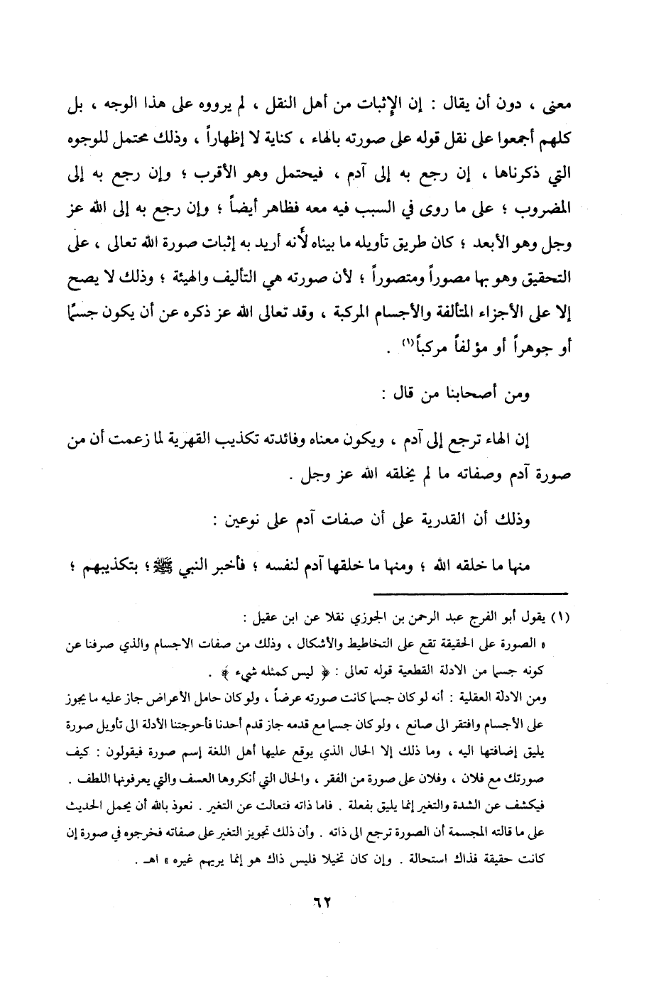 معنى دون أَن يُقَال إِن الْإِثْبَات من أهل النَّقْل لم يرووه على هَذَا الْوَجْه بل كلهم أَجمعُوا على نقل قَوْله على صورته صورته بِالْهَاءِ كِنَايَة لَا إِظْهَارًا وَذَلِكَ مُحْتَمل للوجوه الَّتِي ذَكرنَاهَا إِن رَجَعَ بِهِ إِلَى آدم فَيحْتَمل وَهُوَ الْأَقْرَب وَإِن رَجَعَ بِهِ إِلَى الْمَضْرُوب على مَا روى فِي السَّبَب فِيهِ مَعَه فَظَاهر أَيْضا وَإِن رَجَعَ بِهِ إِلَى الله عز وَجل وَهُوَ الْأَبْعَد كَانَ طَرِيق تَأْوِيله مَا بَيناهُ لِأَنَّهُ أُرِيد بِهِ إِثْبَات صُورَة الله تَعَالَى على التَّحْقِيق وَهُوَ بهَا مصورا ومتصورا لِأَن صورته هِيَ التَّأْلِيف والهيئة وَذَلِكَ لَا يَصح إِلَّا على الْأَجْزَاء المتألفة والأجسام المركبة وَقد تَعَالَى الله عز ذكره عَن أَن يكون جسما أَو جوهرا أَو مؤلفا مركبا