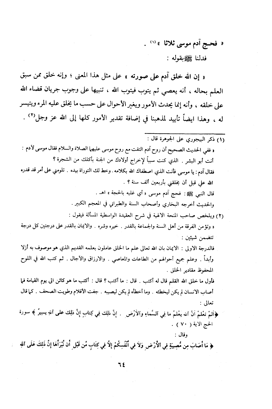 إِن الله خلق آدم على صورته على مثل هَذَا الْمَعْنى وَإنَّهُ خلق مِمَّن سبق الْعلم بِحَالهِ أَنه يَعْصِي ثمَّ يَتُوب فيتوب الله تَنْبِيها على وجوب جَرَيَان قَضَاء الله على خلقه وَأَنه إِنَّمَا يحدث الْأُمُور ويغير الْأَحْوَال على حسب مَا يخلق عَلَيْهِ الْمَرْء ويتيسر لَهُ وَهَذَا أَيْضا تأييد لمذهبنا فِي إِضَافَة تَقْدِير الْأُمُور كلهَا إِلَى الله عز وَجل