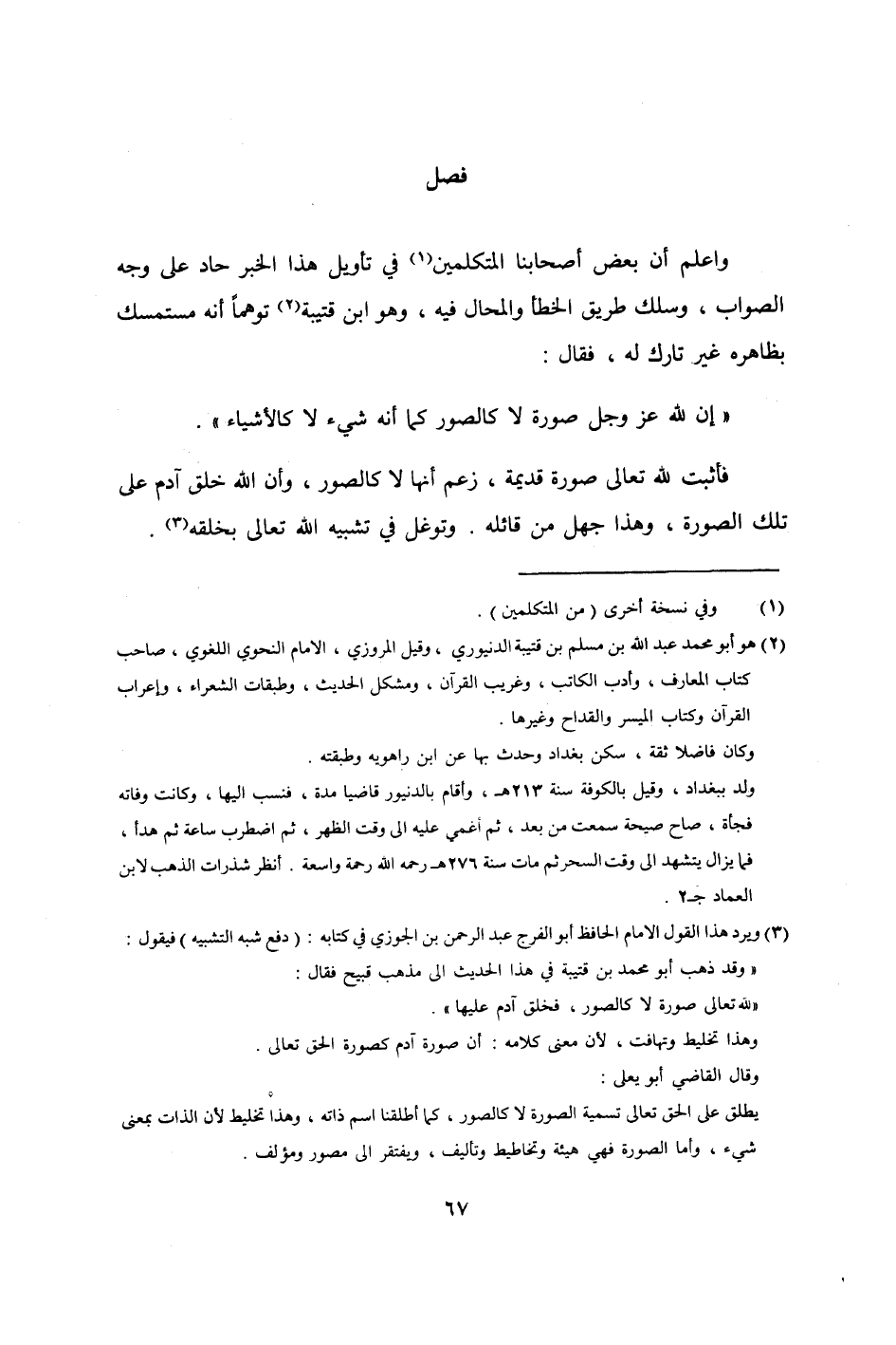 فَأثْبت لله تَعَالَى صُورَة قديمَة زعم أَنَّهَا لَا كالصور وَأَن الله خلق آدم على تِلْكَ الصُّورَة وَهَذَا جهل من قَائِله وتوغل فِي تَشْبِيه الله تَعَالَى بخلقه
